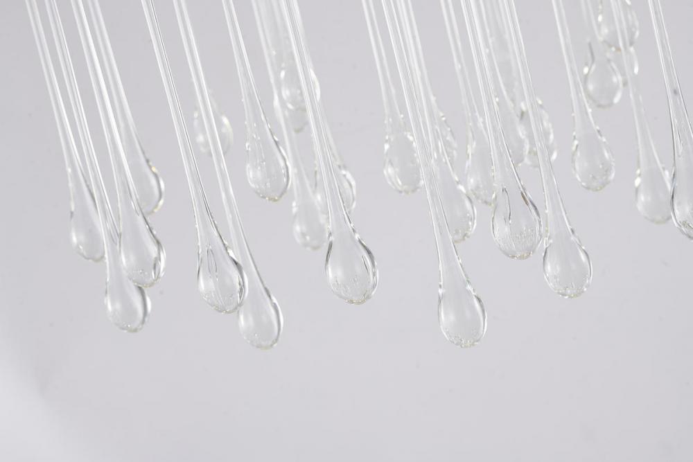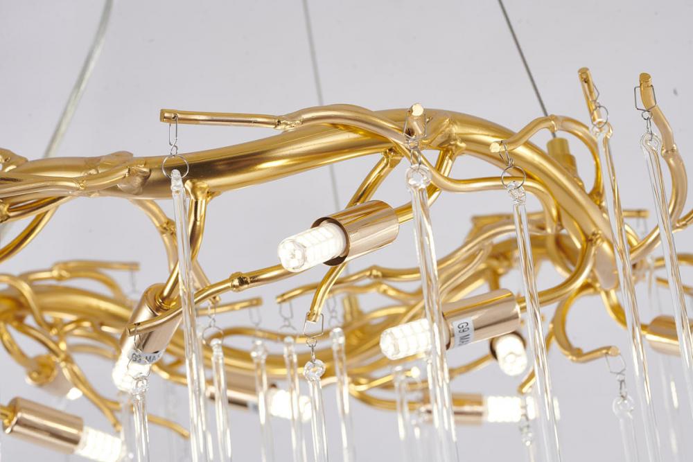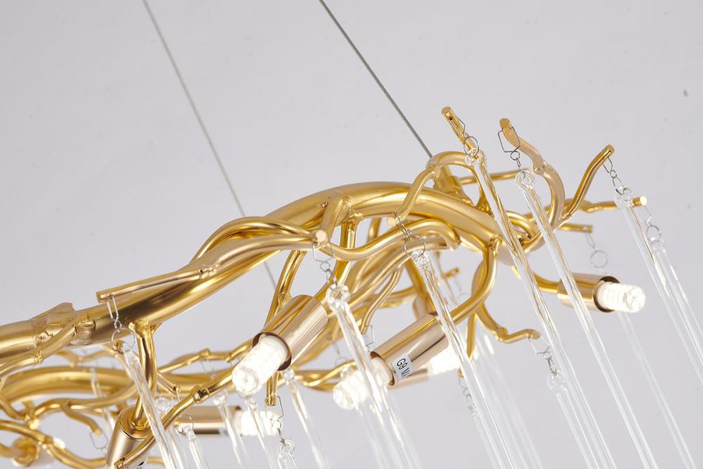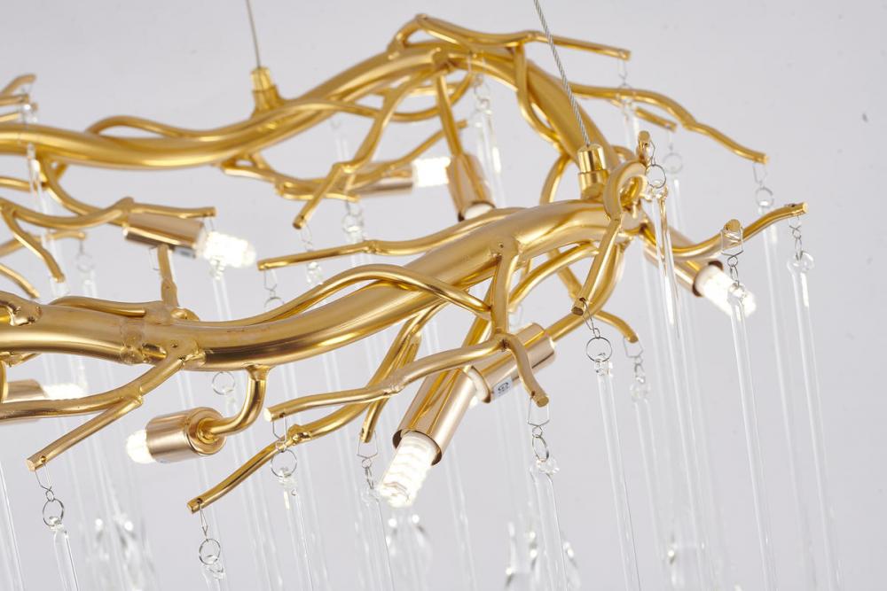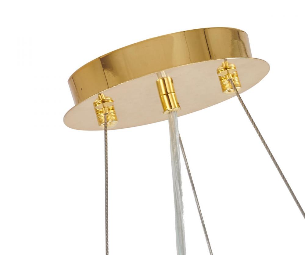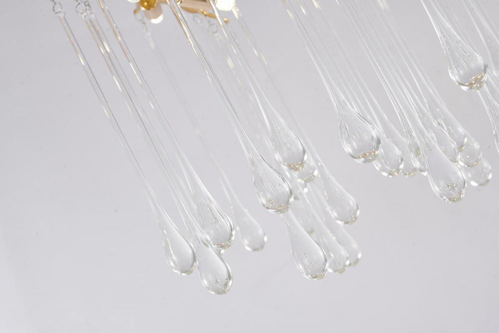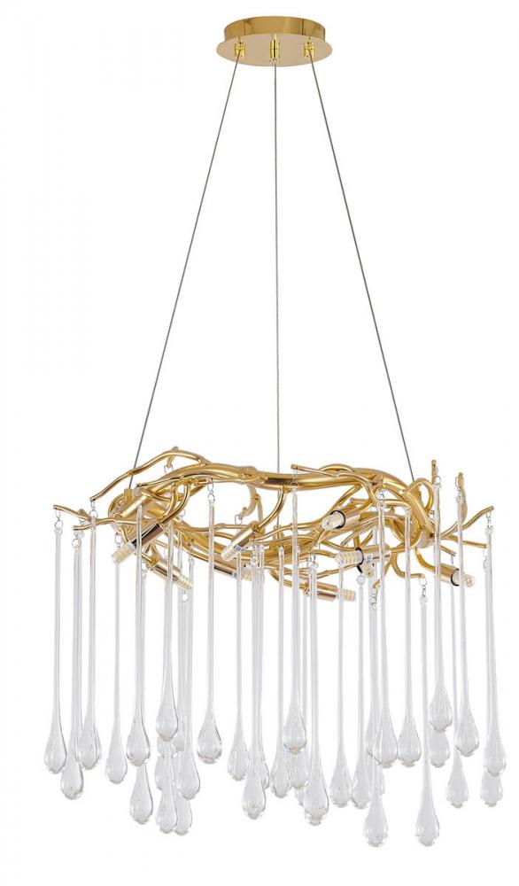 This exquisite chandelier is in a gold finish. The frame is made out of Aluminum, and it comes with clear glass hanging drops. The adjustable cord links make this fixture suitable for most ceiling heights.