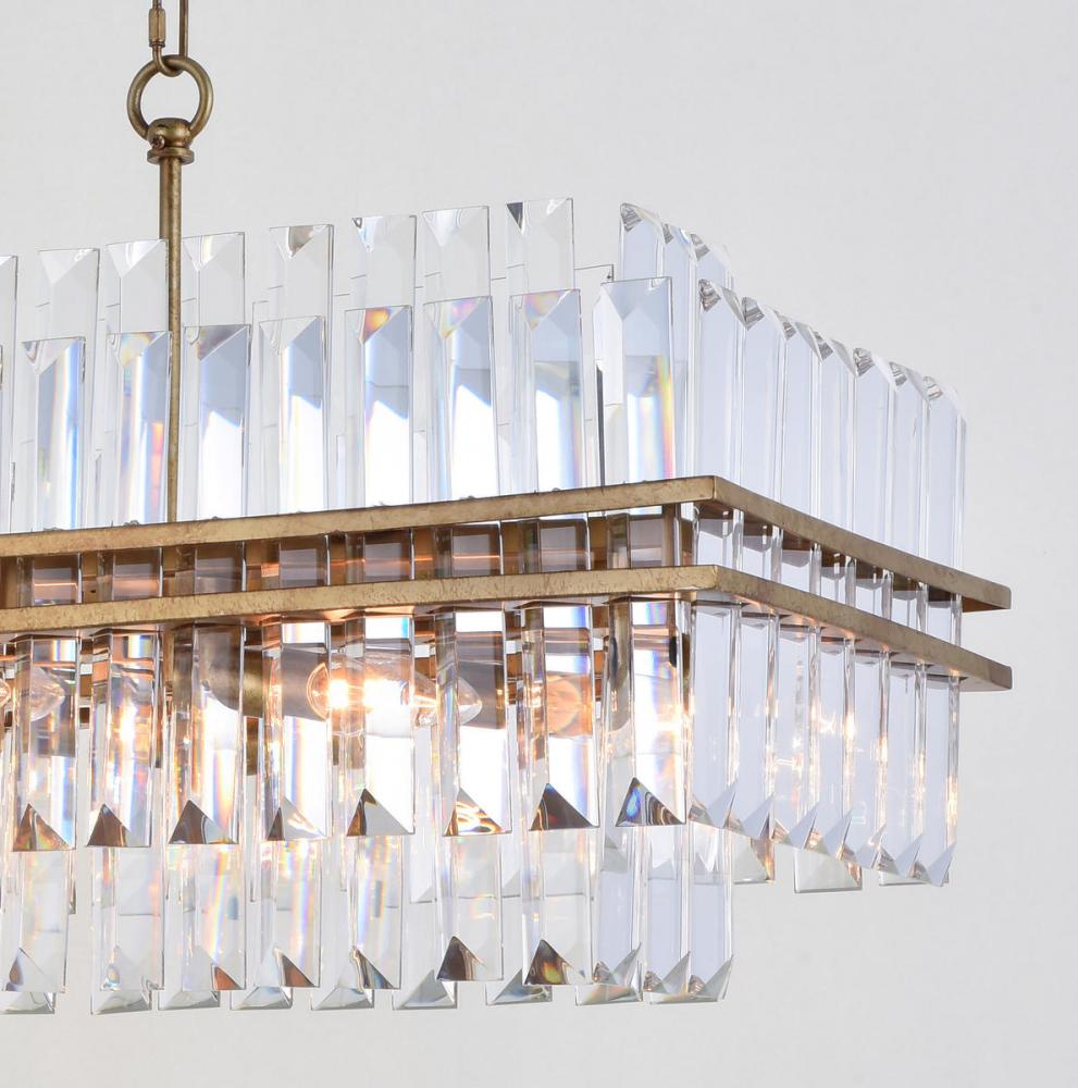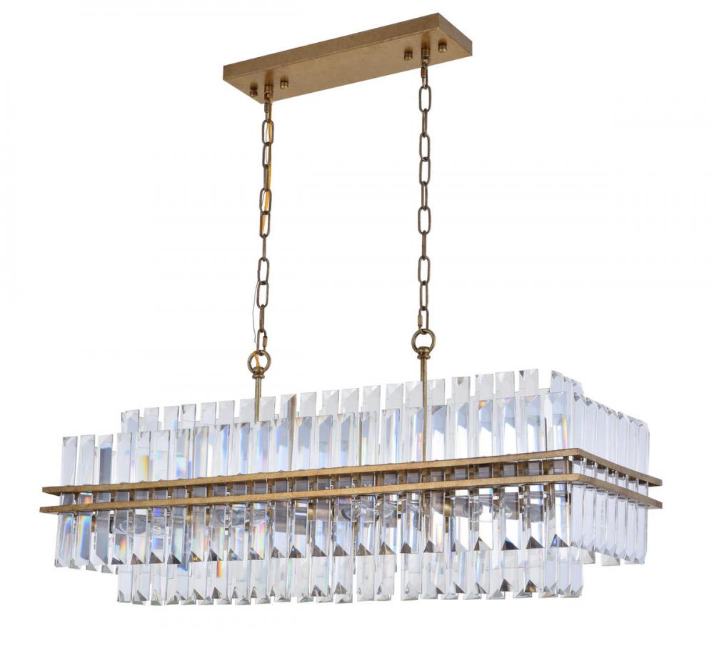 This two-tier chandelier is in a gold finish. The frame is made out of metal, and it comes with clear crystal accents. You can create a timeless feel while using modern forms.