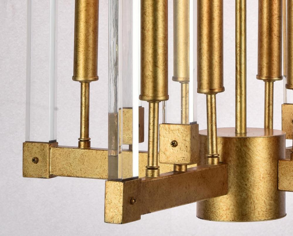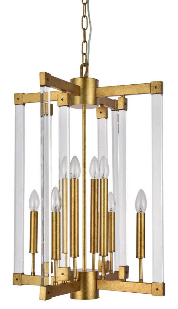 This chandelier is in an antique gold finish. The frame is made out of metal, and it comes with clear acrylic arms. The adjustable chain links makes this fixture suitable for most ceiling heights.