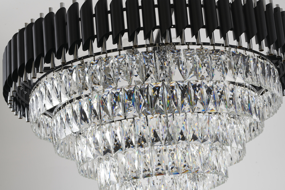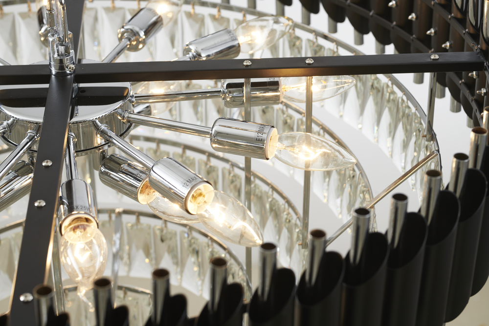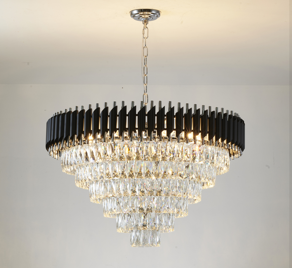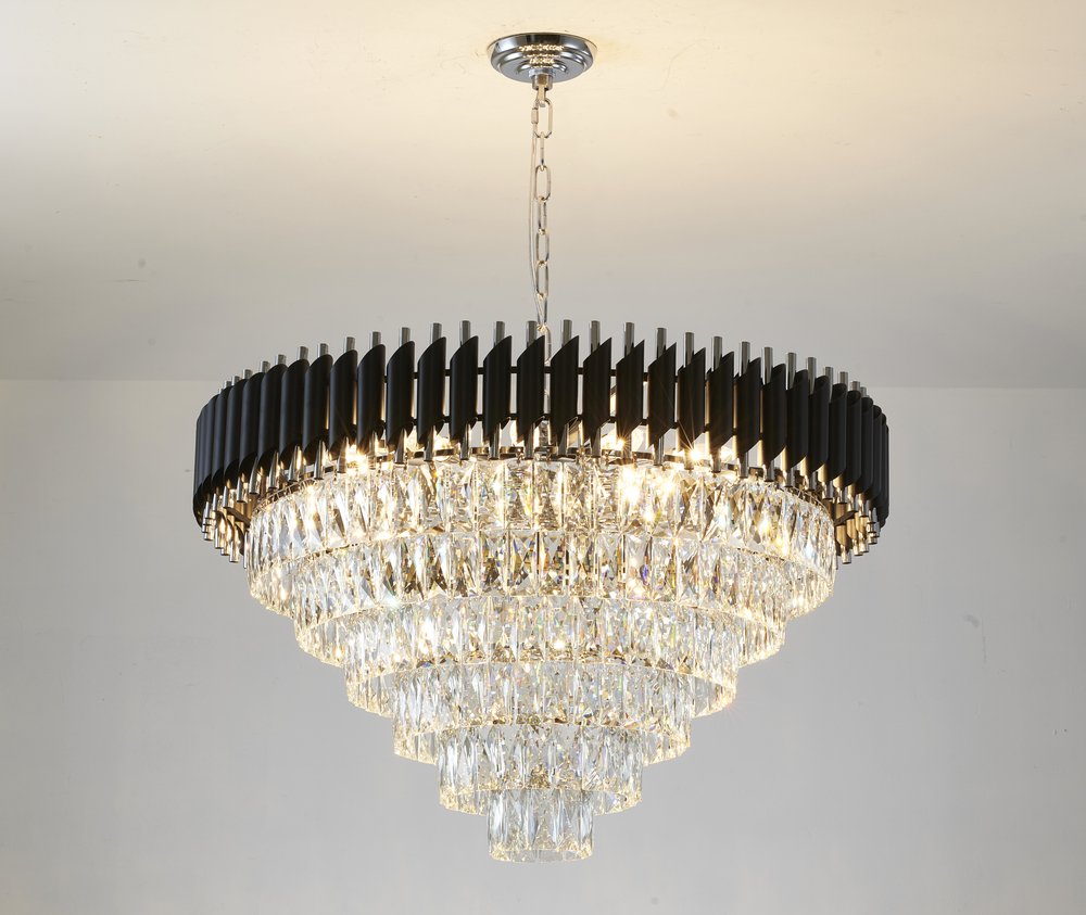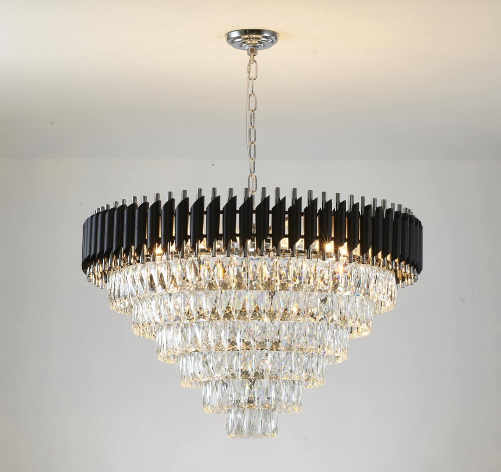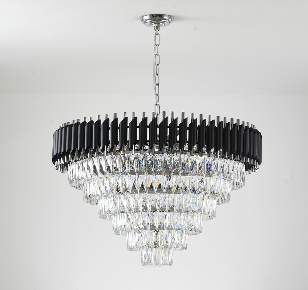 This chandelier is a round black and chrome frame chandelier. It comes with clear hanging crystals. The chain length of 72 inches is provided and the chain length is adjustable.
