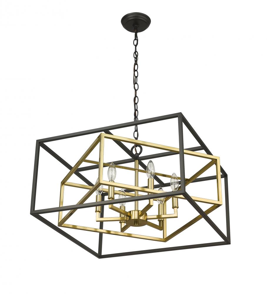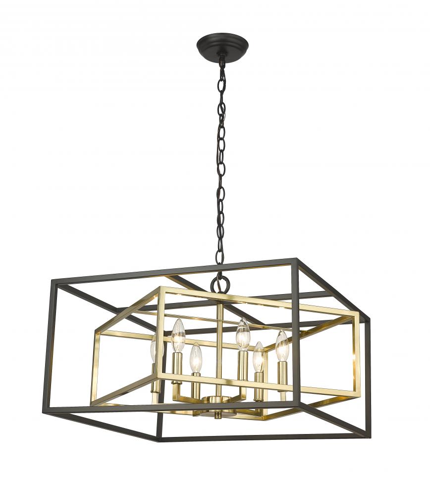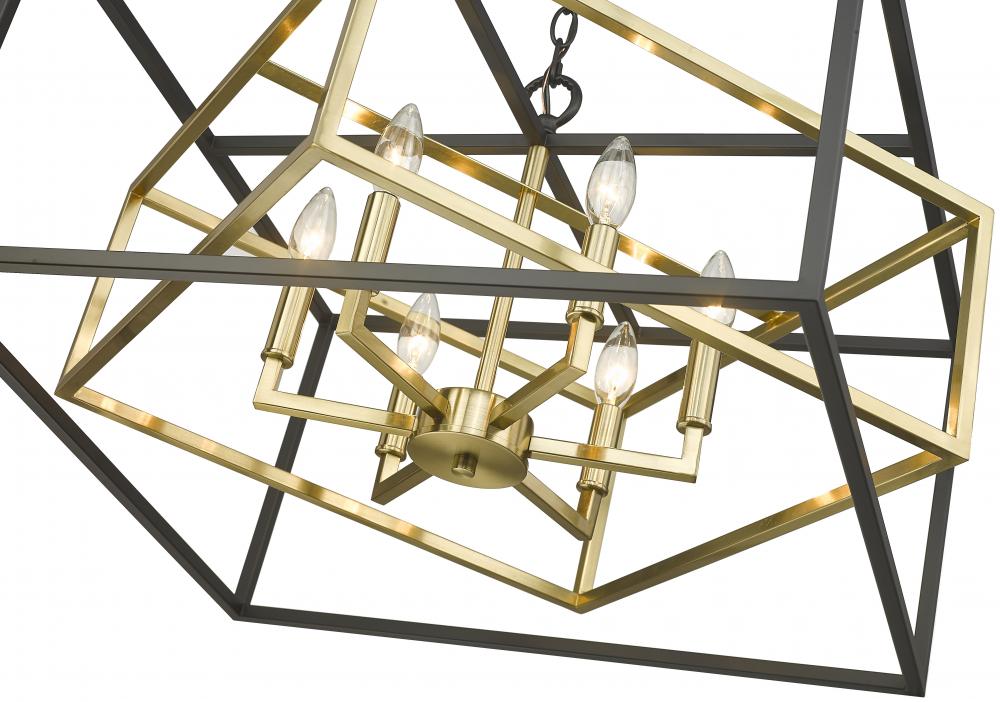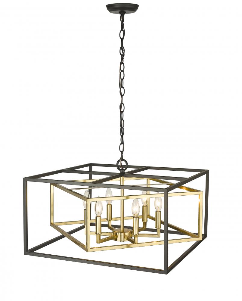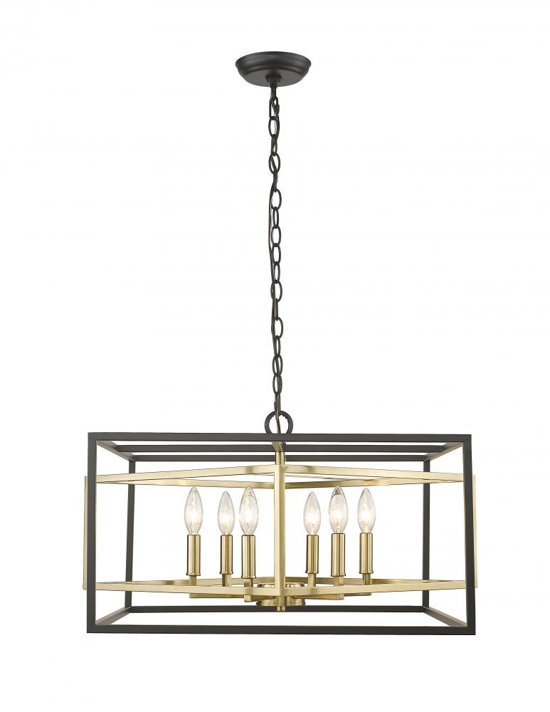 This chandelier has a black and gold iron frame. It comes with 72 inch long chain. The adjustable chain link makes this fixture suitable for most ceiling heights.