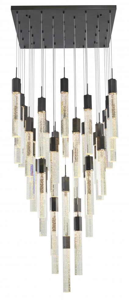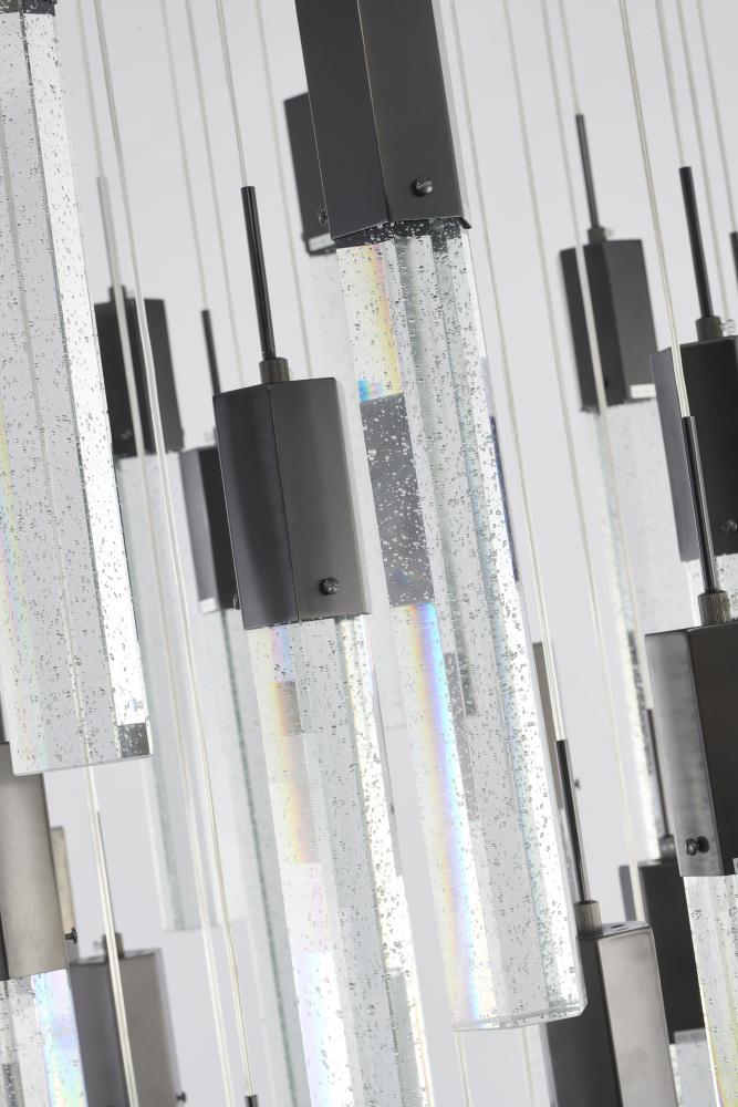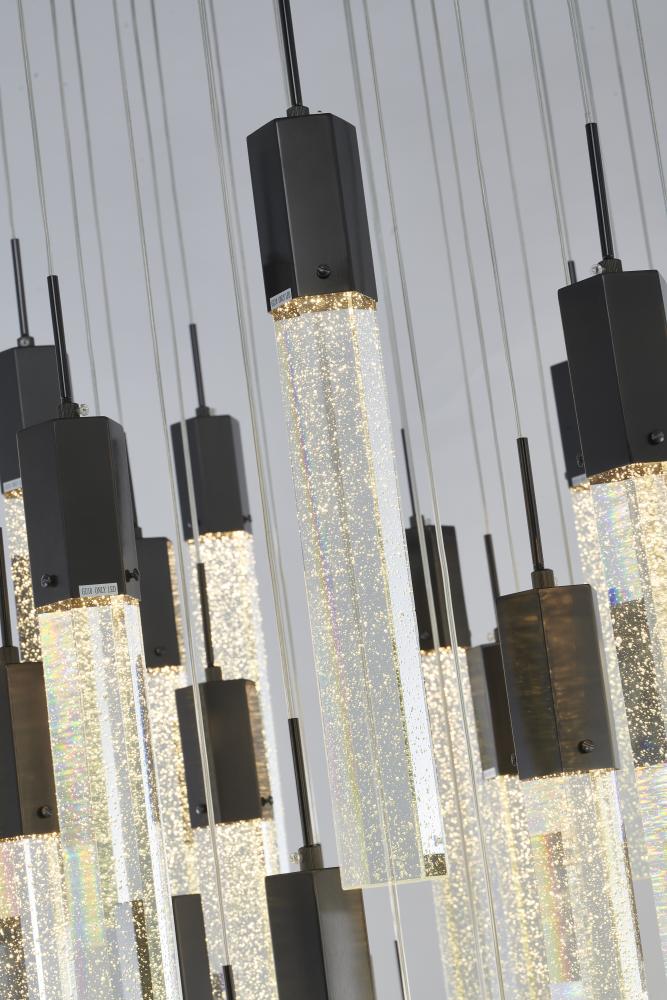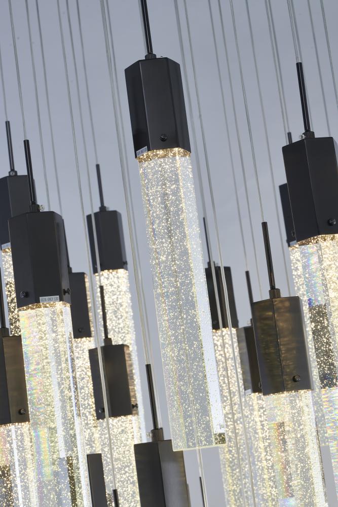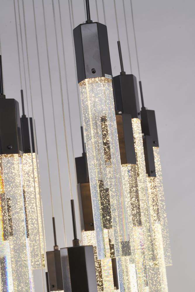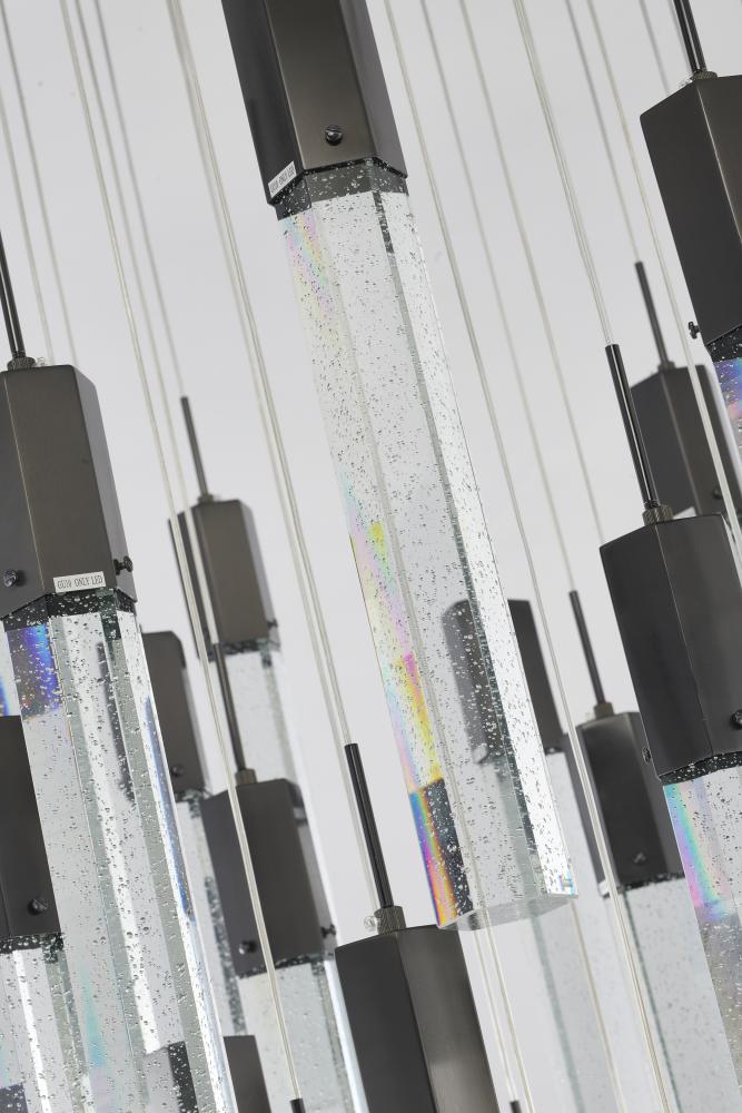 This chandelier is a black gun metal flushed chandelier. It comes with clear hexagon bubble crystal hanging pendants. The cord length of 3.7 meters is provided and the cord length is adjustable.