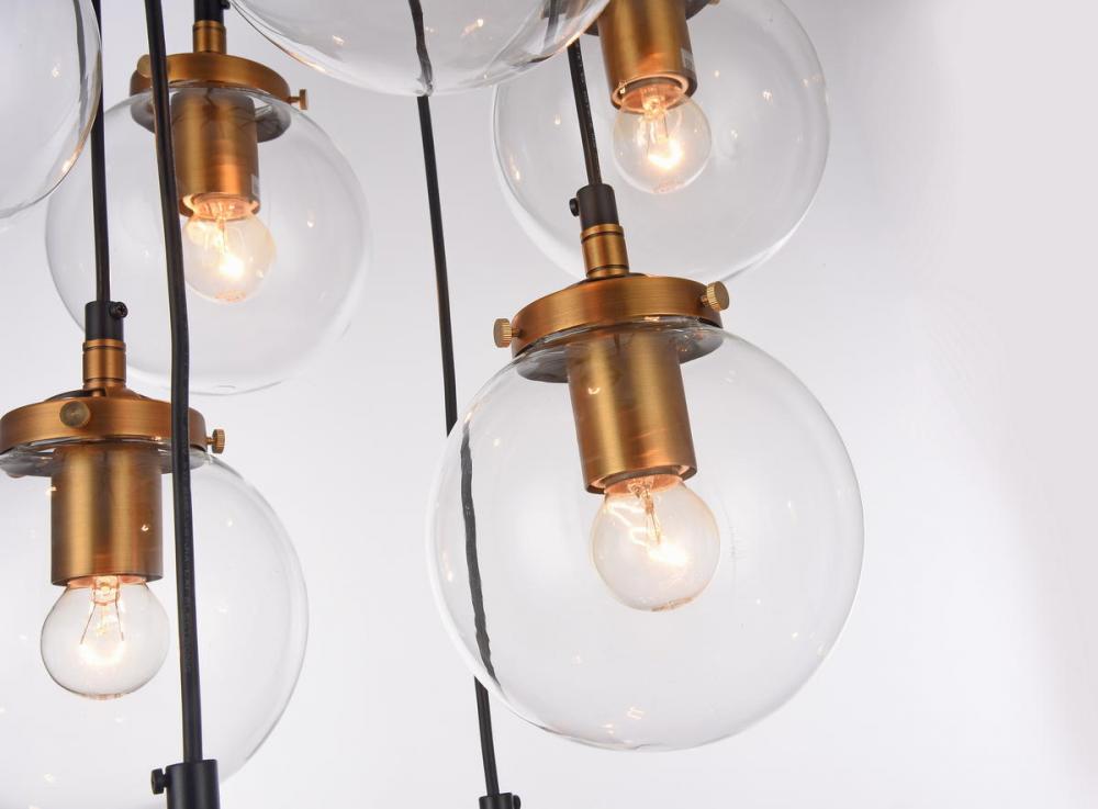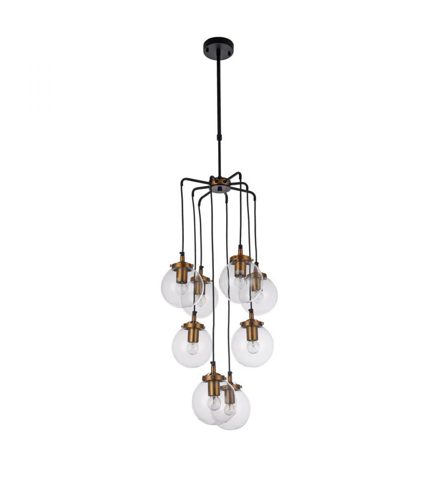 This exquisite fixture is in a black finish with eight glass shade in clear color. The socket and hardware are brass. It can be used in any room and provide better illumination.