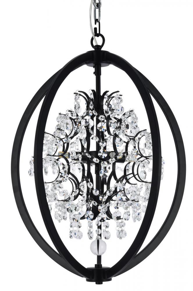 This exquisite chandelier is in a black finish. The frame is made out metal in a sphere cage shape, and it comes with clear hanging beaded crystals. The adjustable chain link makes this fixture suitable for most ceiling heights.