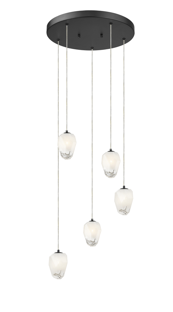 This chandelier is a round black frame chandelier. It comes with hanging white glass pendants. The cord length of 7 feet is provided and the cord length is adjustable.