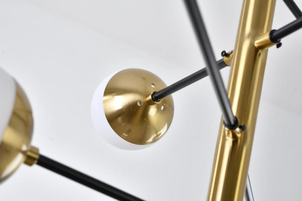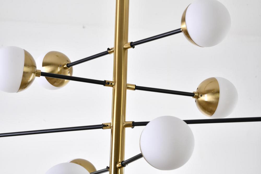This exquisite chandelier is in gold and black finish. The frame is made out of metal, and it comes with milk white glass shades. The adjustable rod link makes this fixture suitable for most ceiling heights.