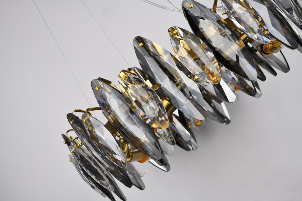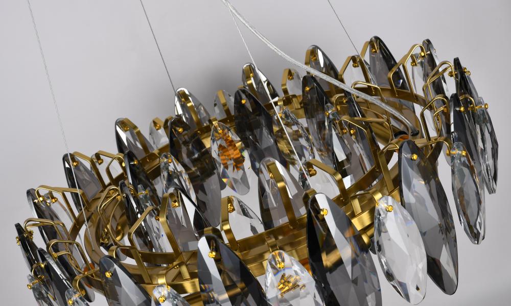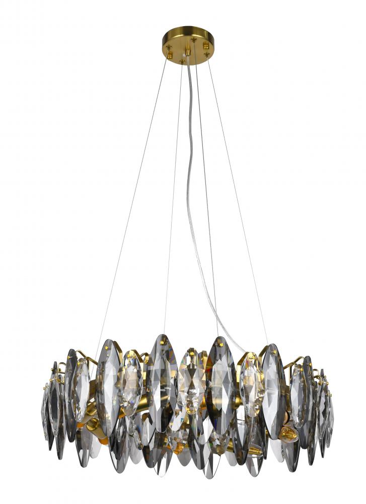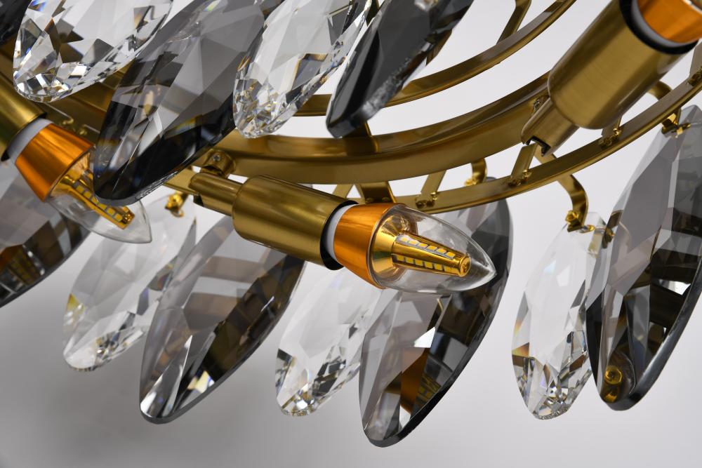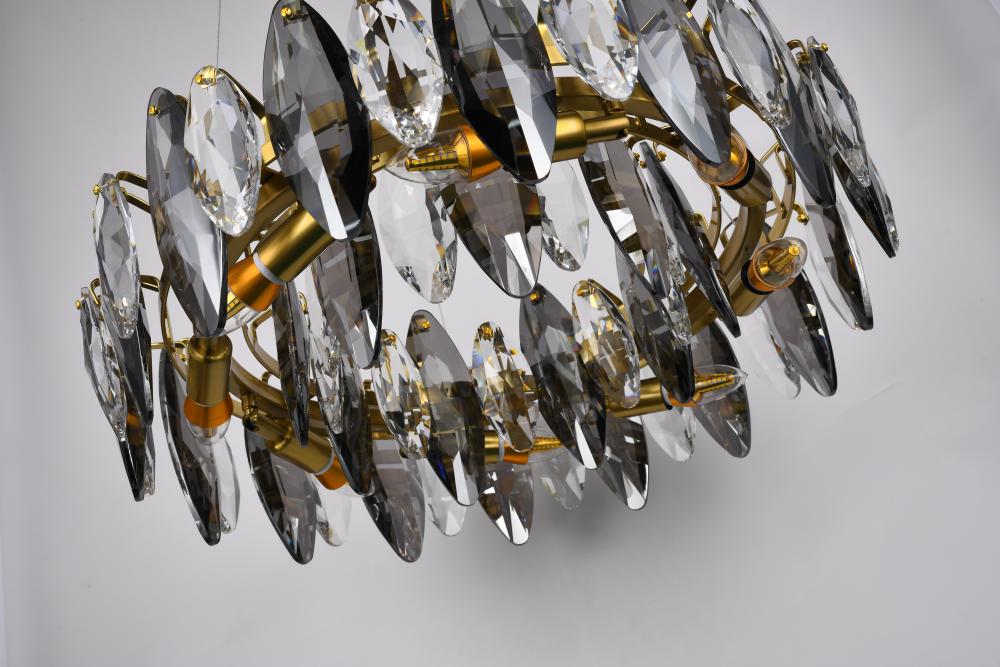 This chandelier is in a brass finish. It comes with clear and smoke crystals. The cord length of 47 inches is provided and the cord length is adjustable.