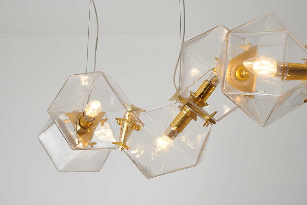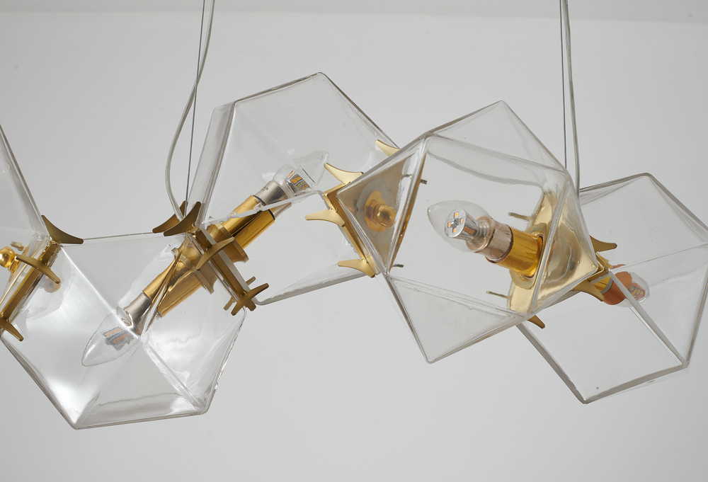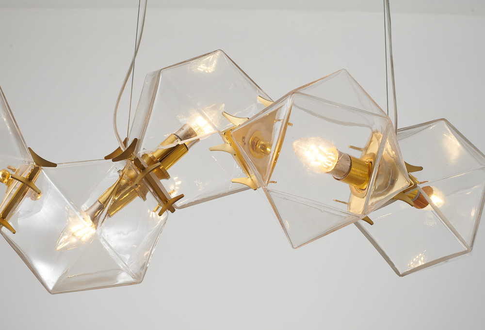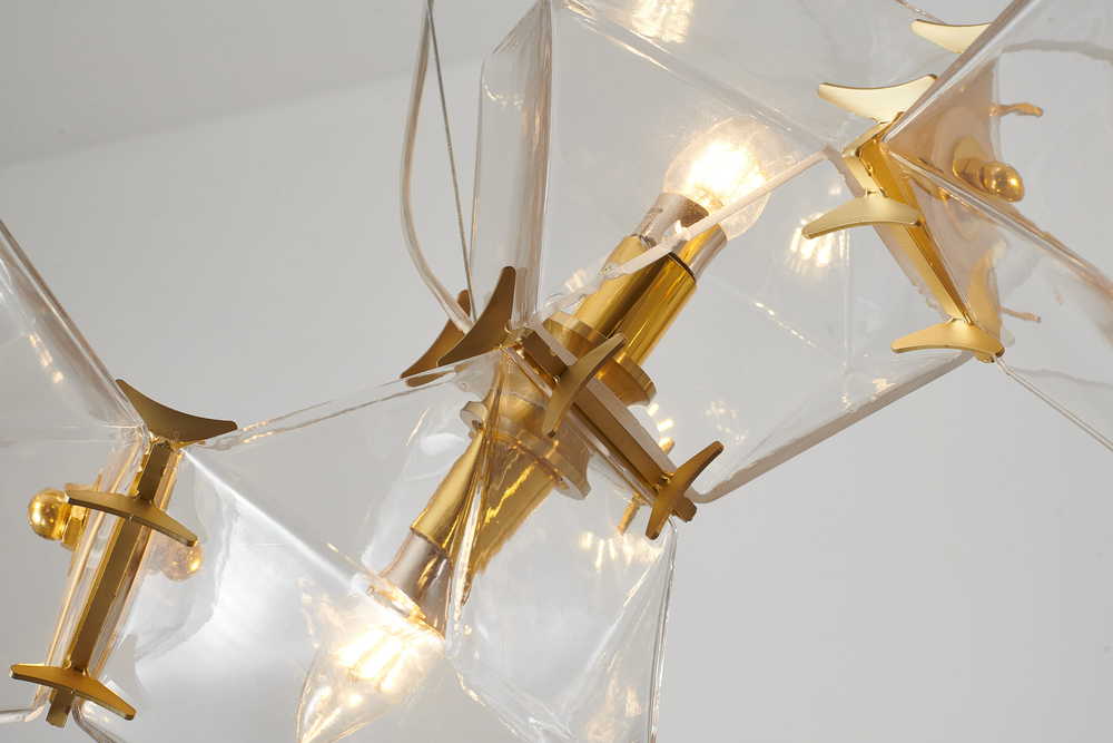 This exquisite chandelier is in a brass gold finish. The frame is made out of metal, and it comes with clear geometric connecting glass blocks. The adjustable links make this fixture suitable for most ceiling heights.