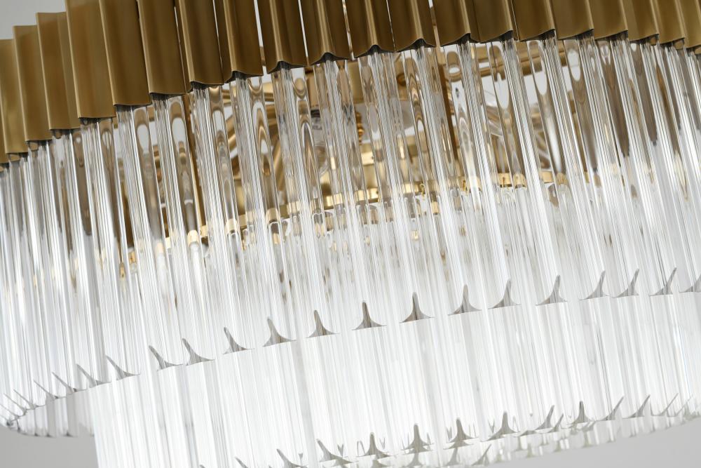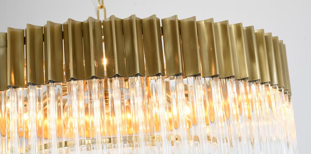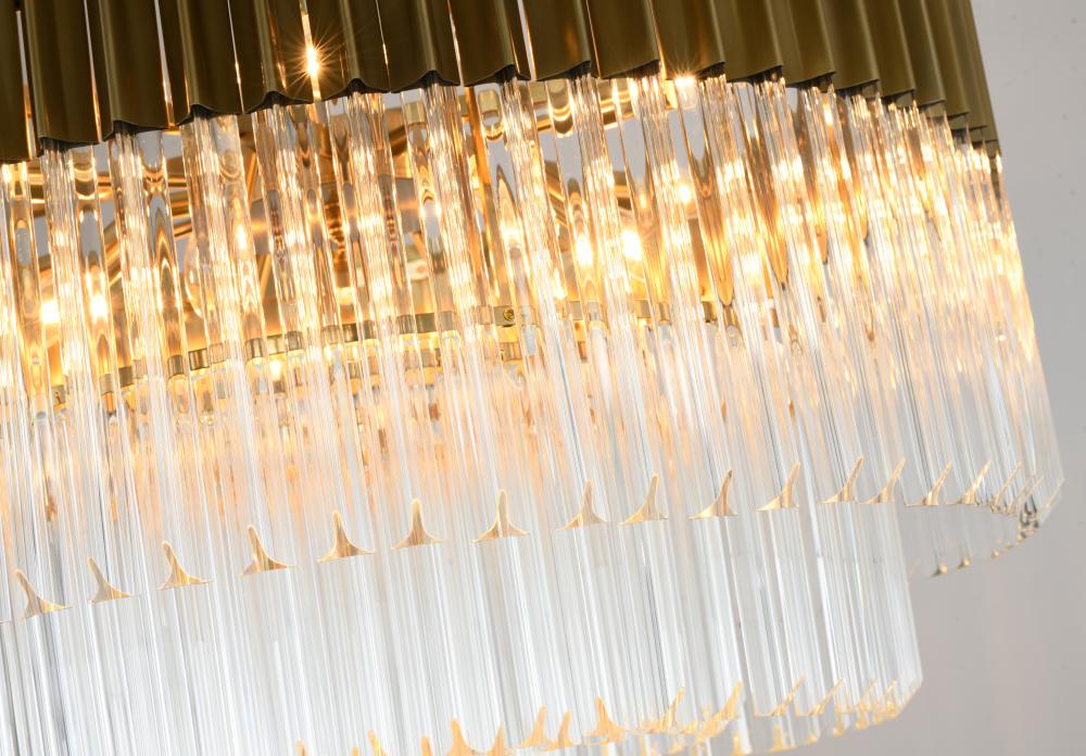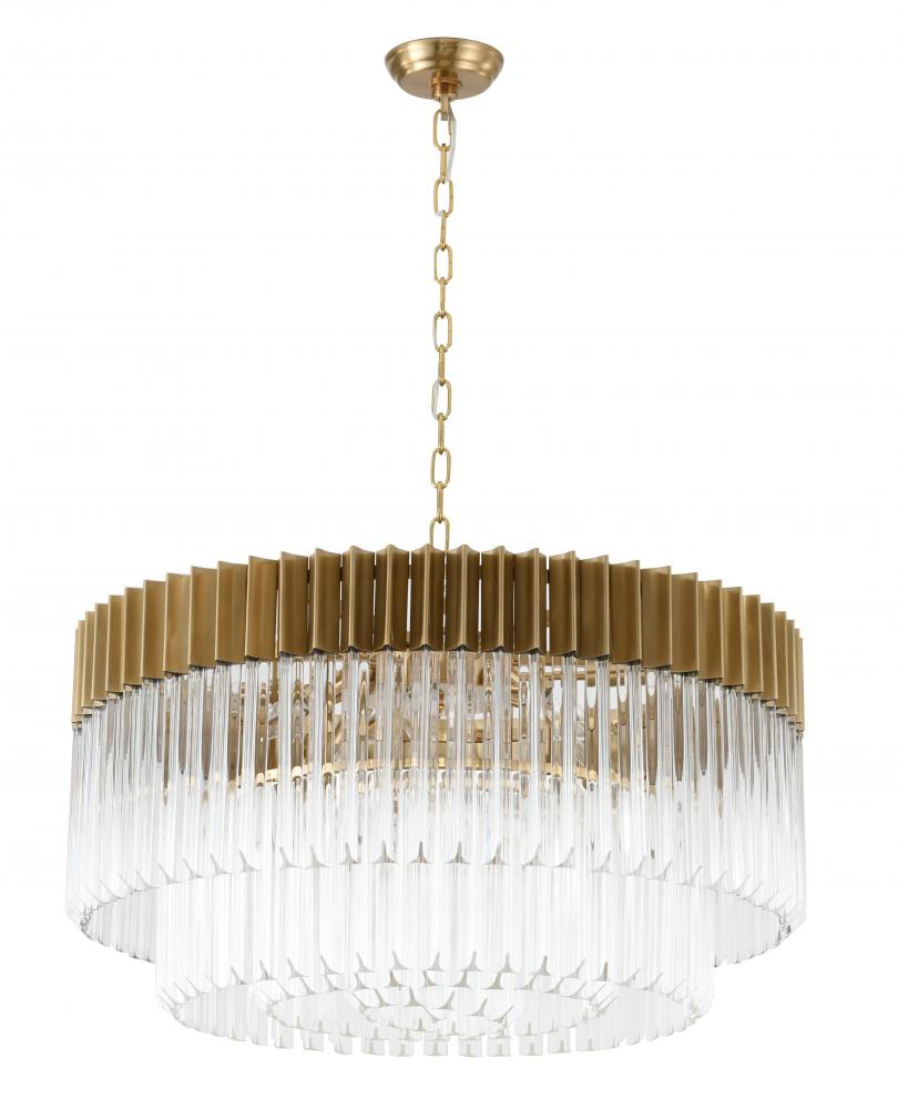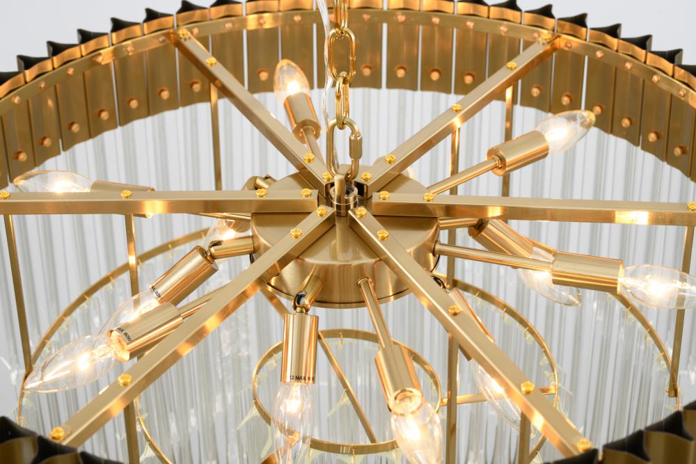 This chandelier is a round brass stainless steel chandelier. It come with clear hanging crystals. The chain length of 59 inches is provided and the chain length is adjustable.