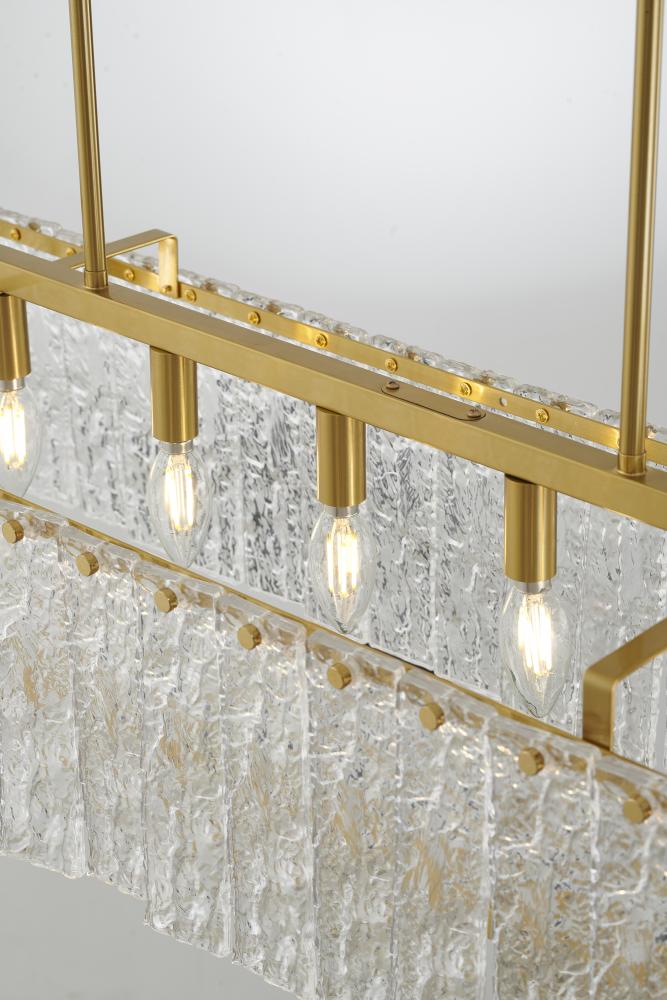 This chandelier is a rectangular brass frame chandelier. It comes with hanging clear rippled glass. The rod lengths of 12" + 12" + 6" + 6" is provided and the rod length is adjustable.