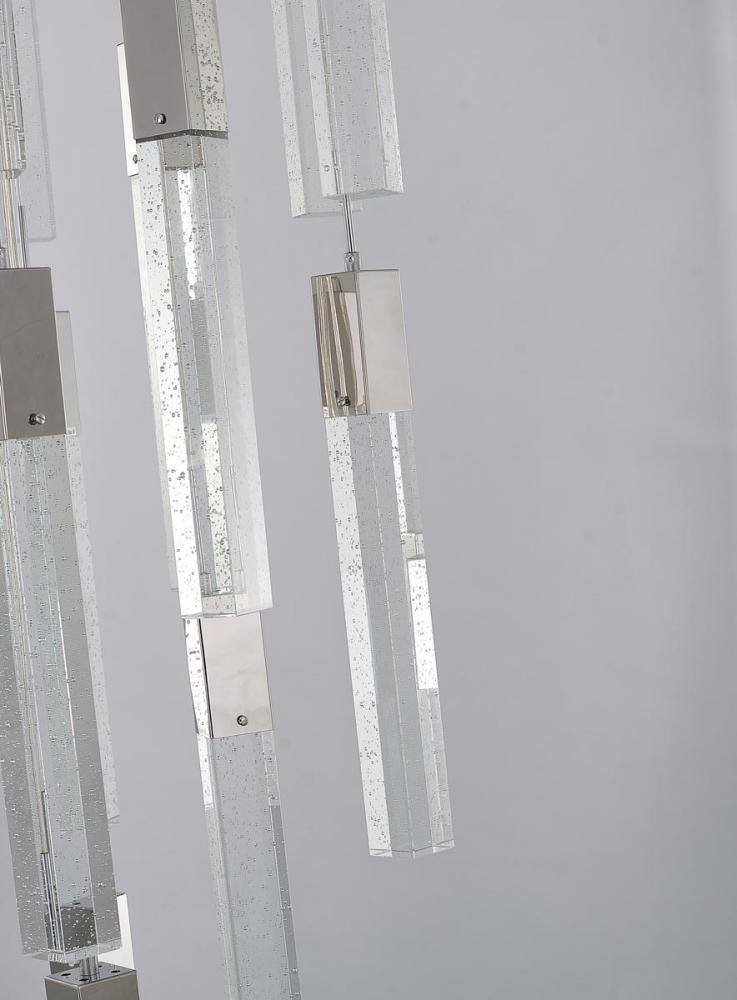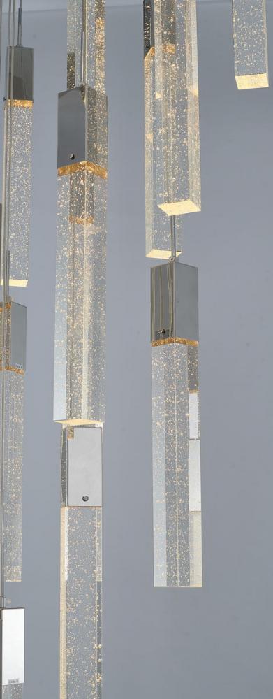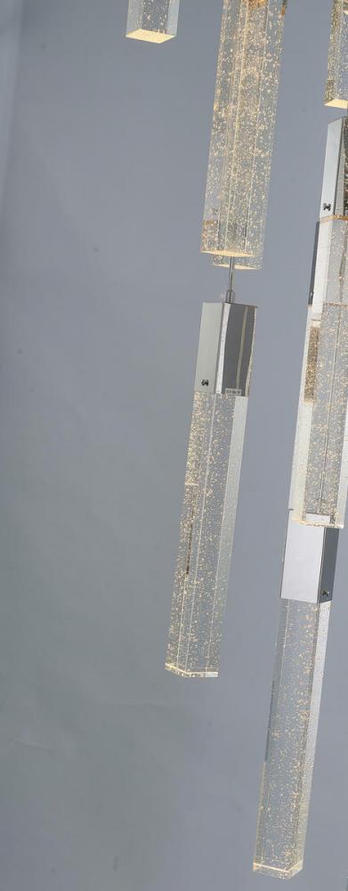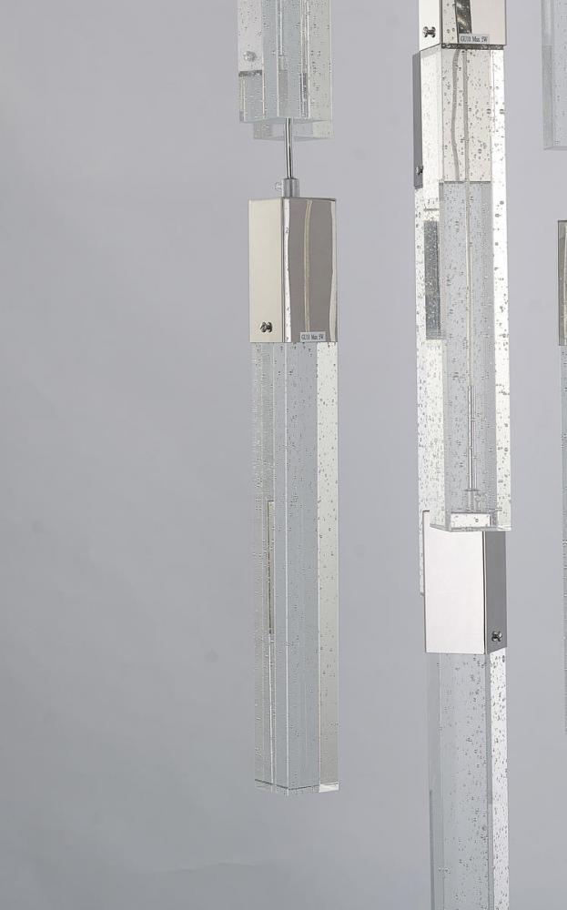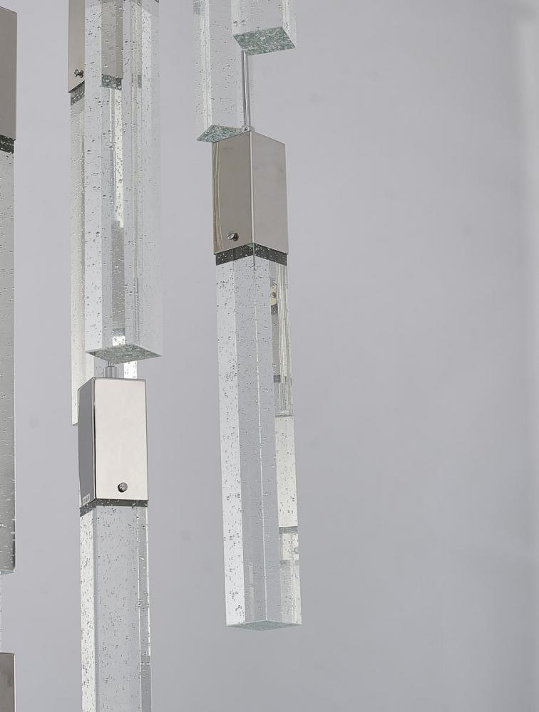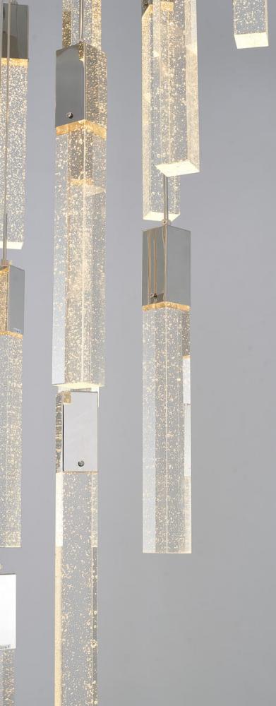 This exquisite chandelier is in a chrome finish. The frame is made out of metal, and it comes with hanging clear bubble block crystals. The length of cords can be adjustable and make this fixture suitable for most ceiling heights
