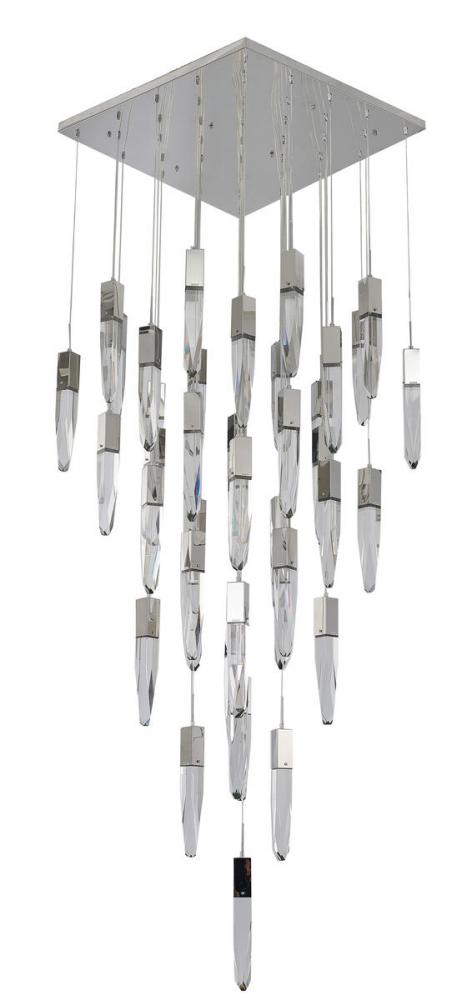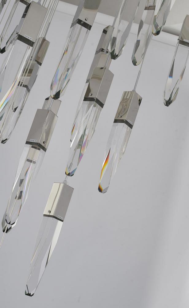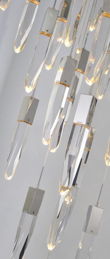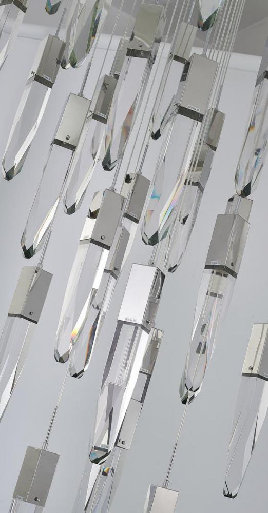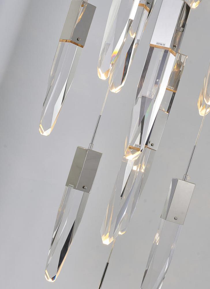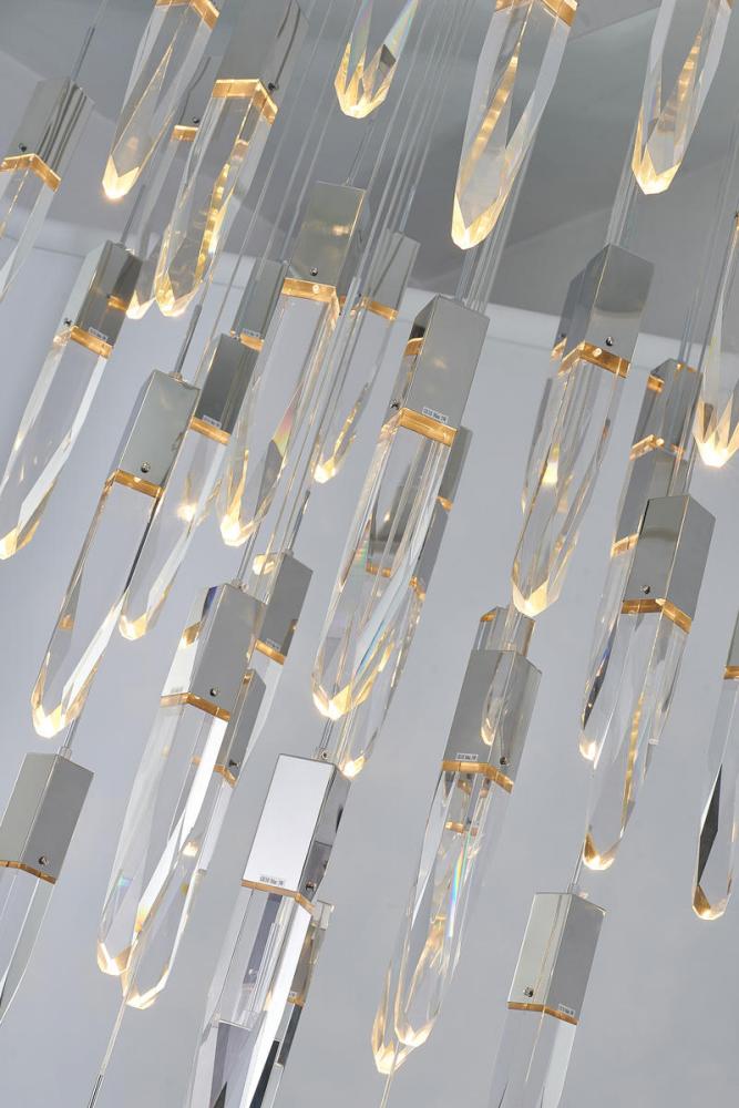 This exquisite chandelier is in a chrome finish. The frame is made out of metal, and it comes with hanging clear iceberg bubble crystals. The length of cords can be adjustable and make this fixture suitable for most ceiling heights