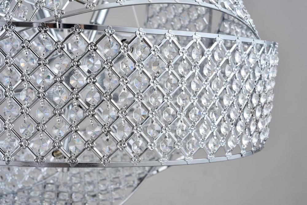 This modern has a chrome metal frame with crystal accents in clear color. The adjustable cord links make this fixture suitable for most ceiling heights. You can create a timeless feel while using modern forms.