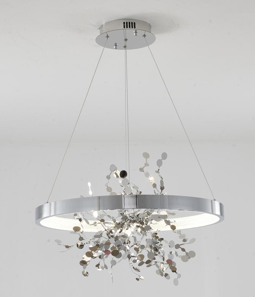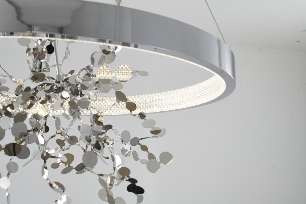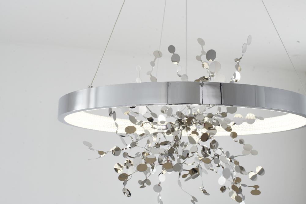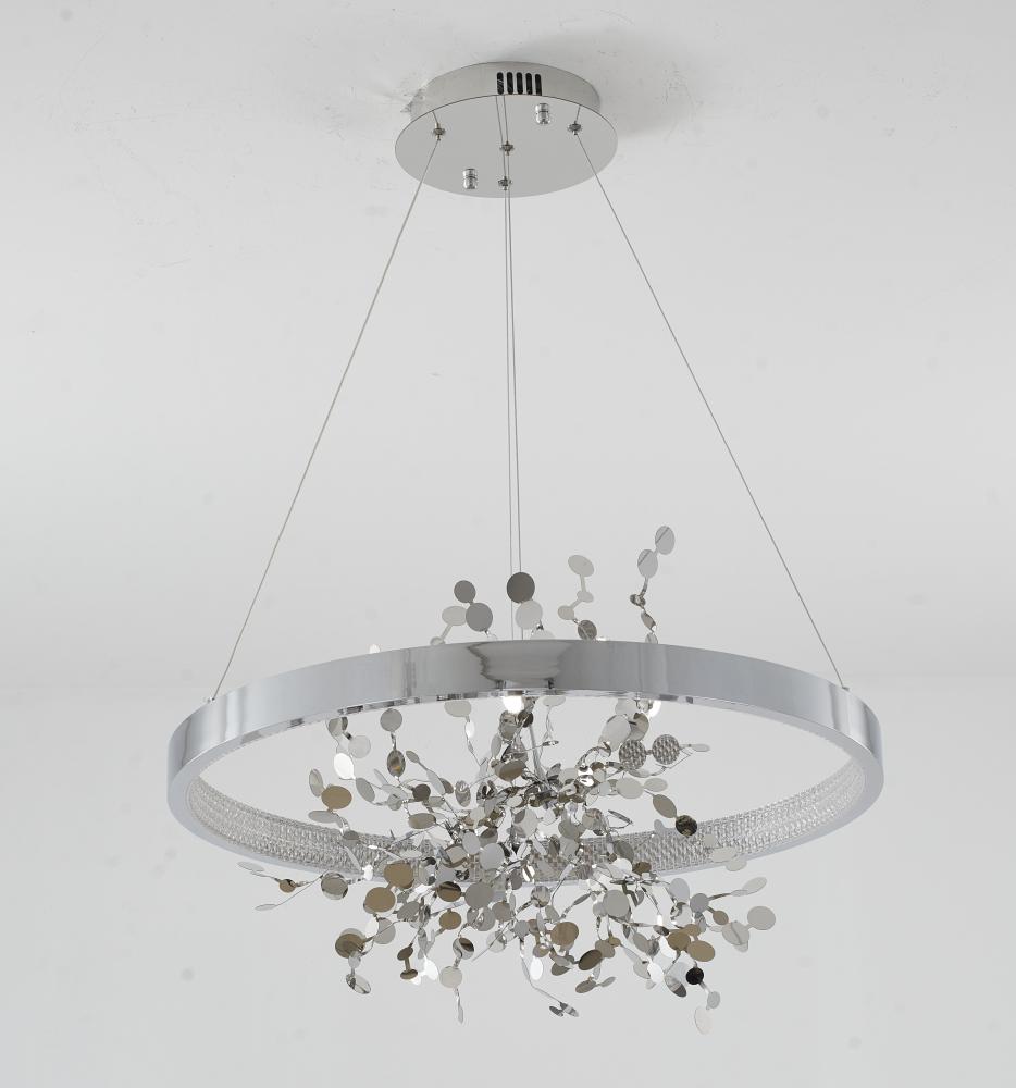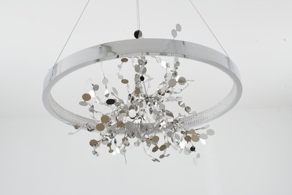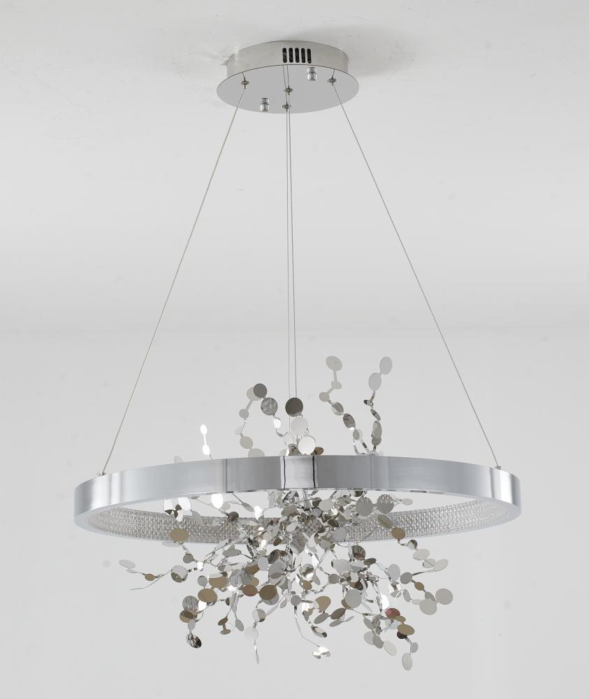 This chandelier is in a chrome finish. It comes with a chrome stainless steel confetti interior and a transparent diffuser. The cord length of 78 inches is provided and the cord length is adjustable.