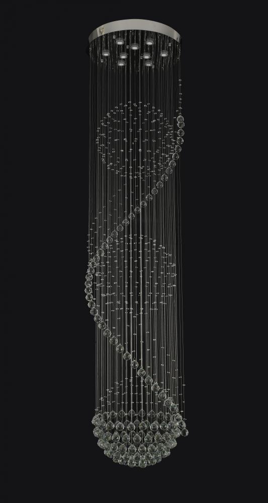 This chandelier is a chrome flushed chandelier. It comes with clear hanging crystals and beads. The materials for this chandelier consists of stainless steel and crystal.