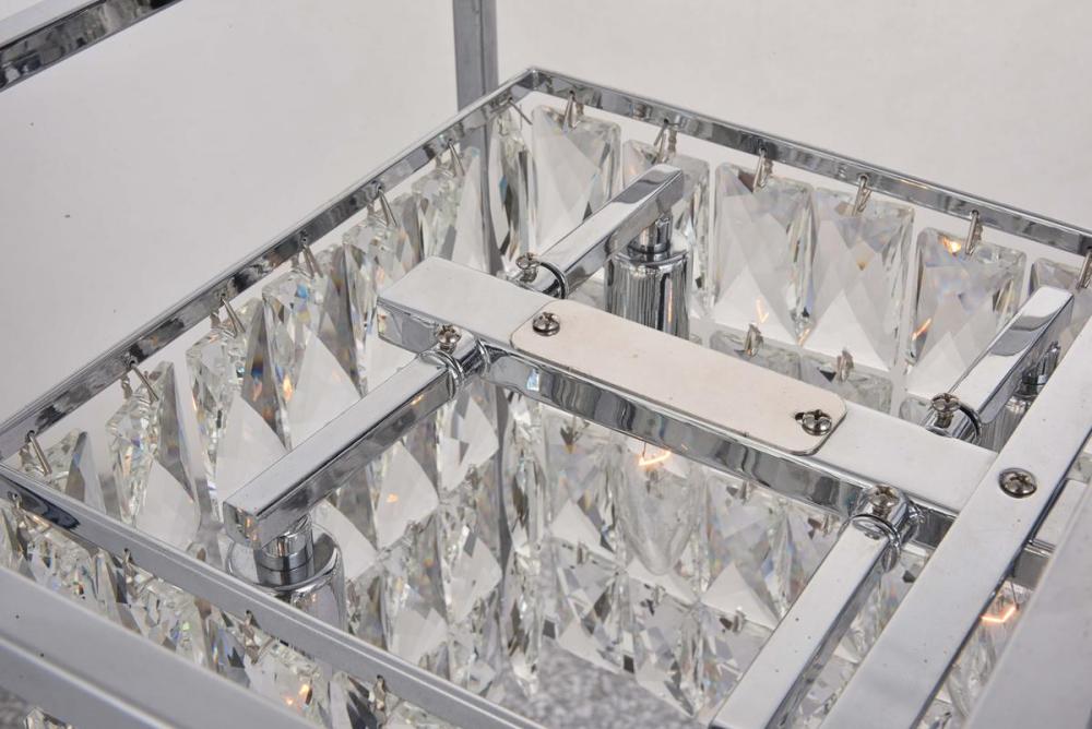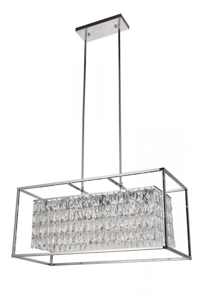 This modern chandelier is in a chrome finish. It has rectangular shape with crystal beaded draping in a clear color. It can be used in any room