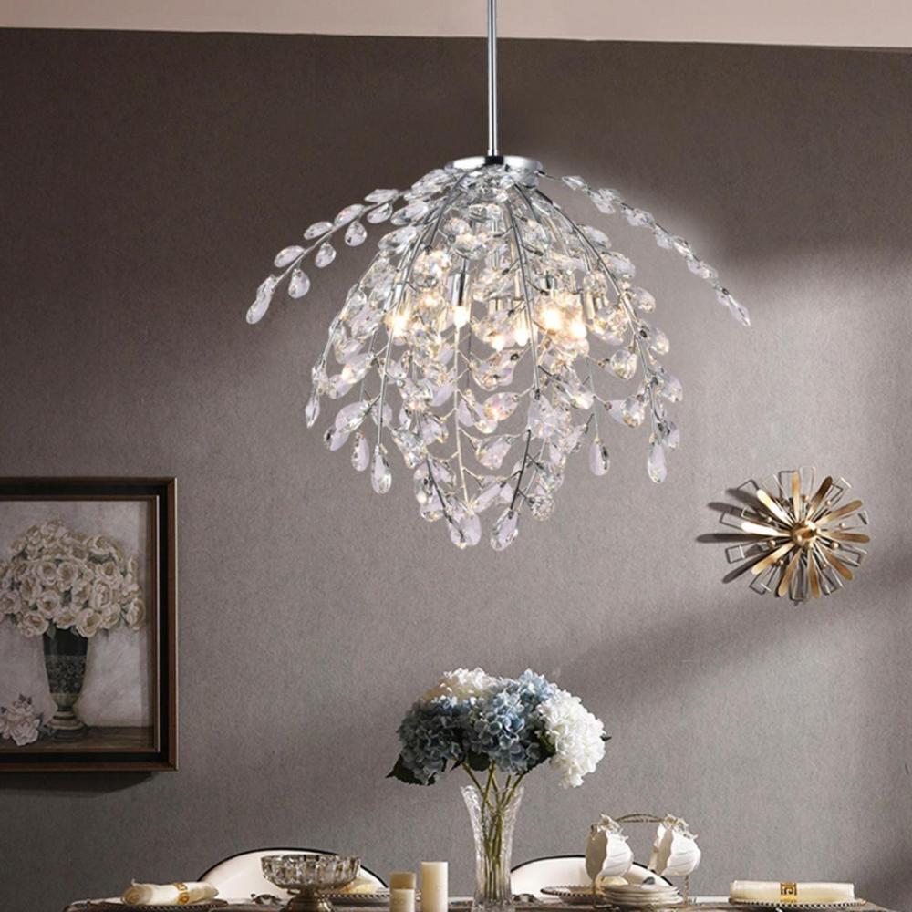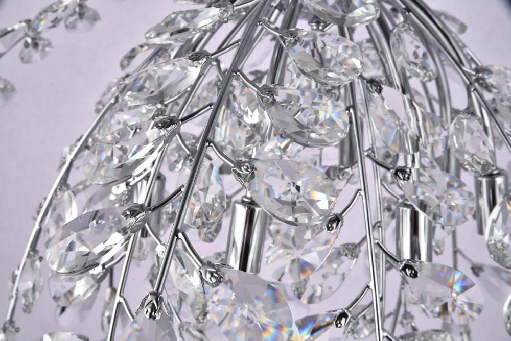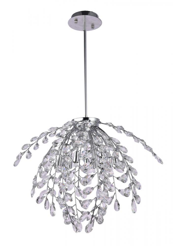 This chandelier is in a chrome finish. The frame looks like a branch with crystal accents, adding more even modern. This fixture can be used in any room.