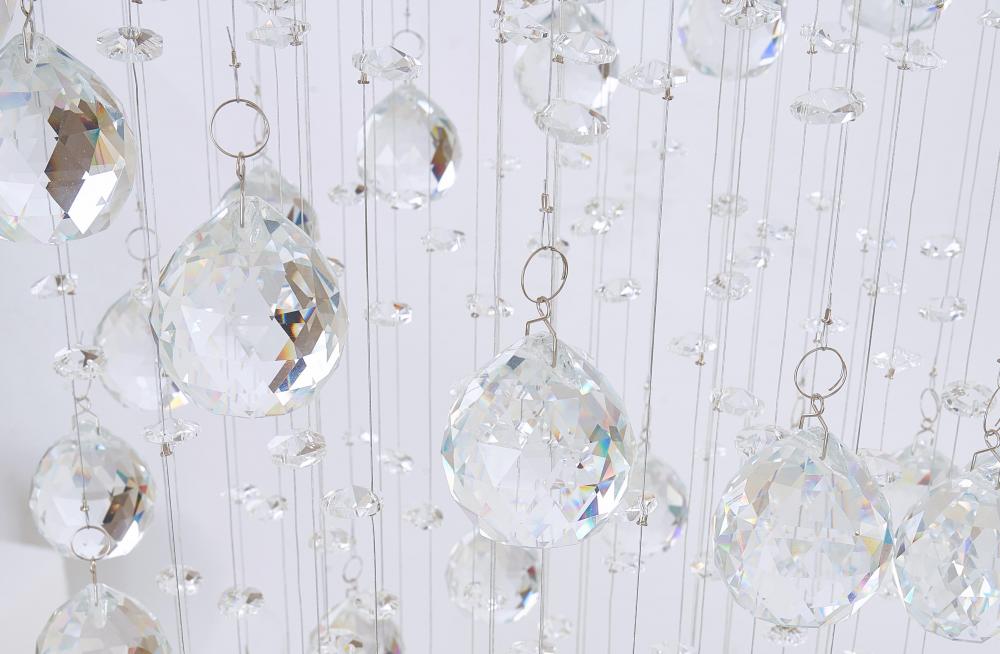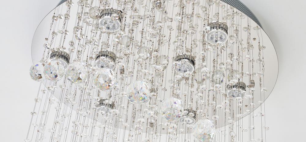 This chandelier is a flushed chrome frame chandelier. It comes with a spiral of hanging clear crystals. The materials for this chandelier consists of stainless steel and crystal.