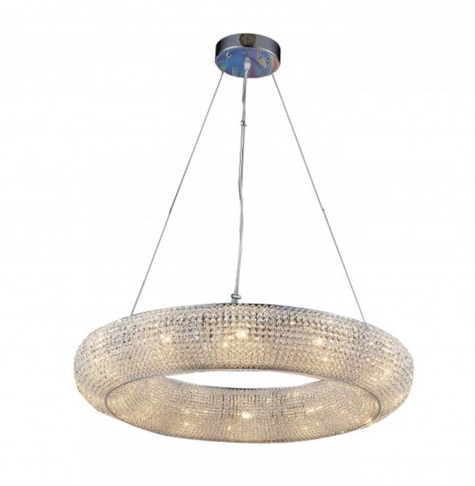 This exquisite chandelier is in a chrome finish. The frame is made out of metal in a round halo ring shape, and it comes with beaded crystal accents in clear color. The adjustable cord links make this fixture suitable for most ceiling heights.