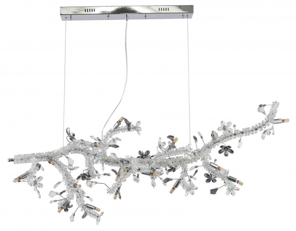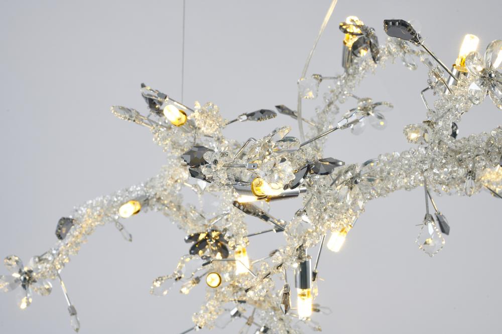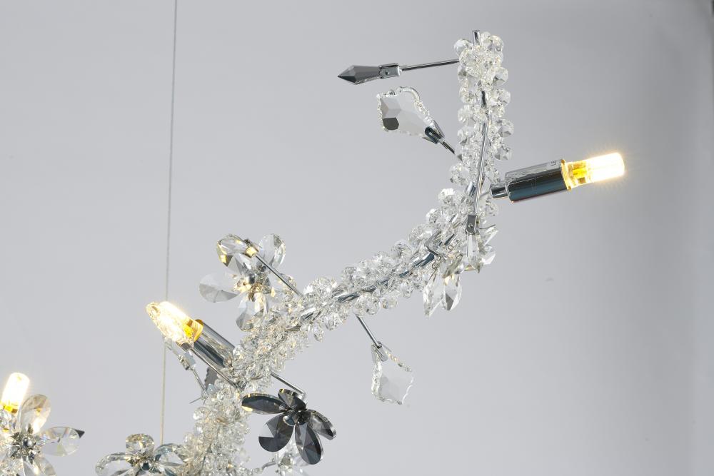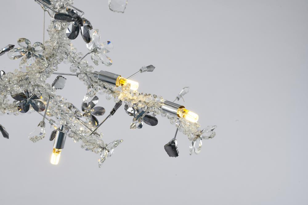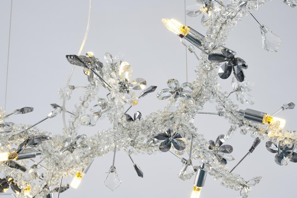 This chandelier is a clear and smoke crystal branch chandelier. It comes with chrome hardware and flower accents. The cord length of 60 inches is provided and the cord length is adjustable.