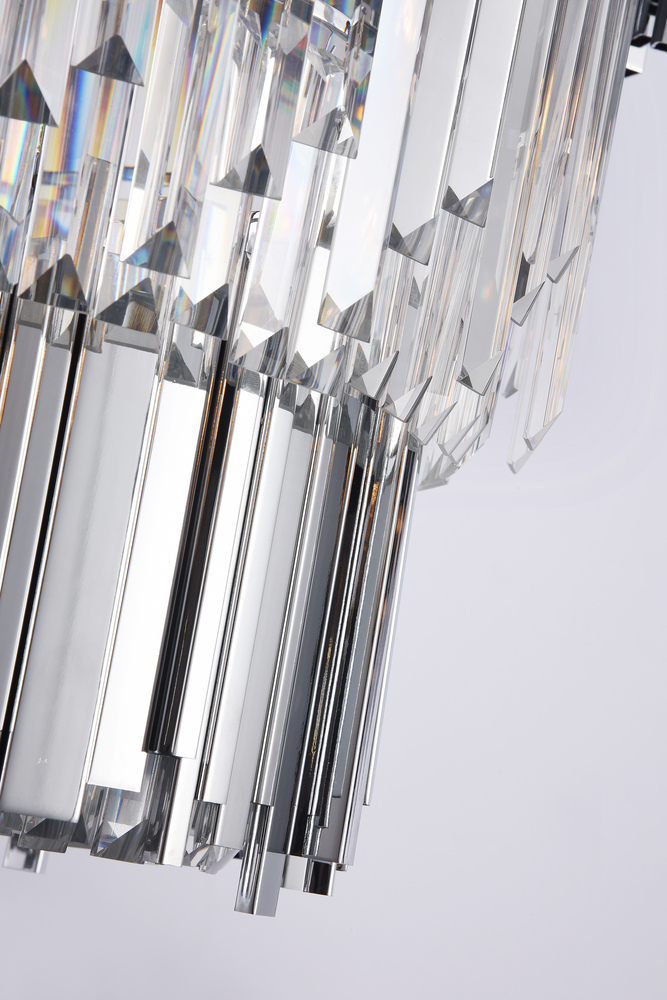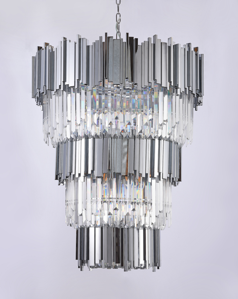 This three-tier chandelier is in a gold finish. This chandelier has a gold rod border with hanging clear crystal adornments.