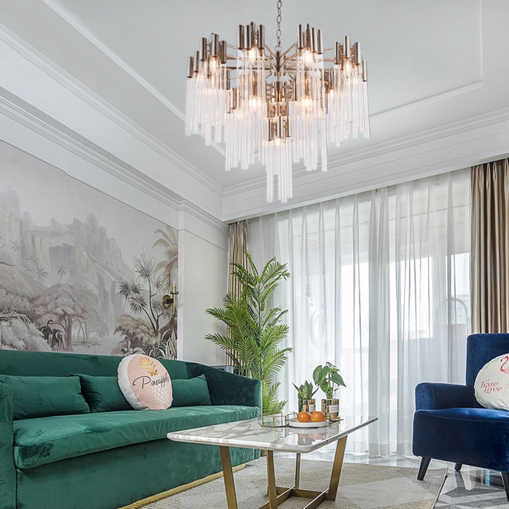 This three tier chandelier has a chrome metal frame. It comes with glass tube rods in clear color. The adjustable chain link makes this fixture suitable for most ceiling heights.