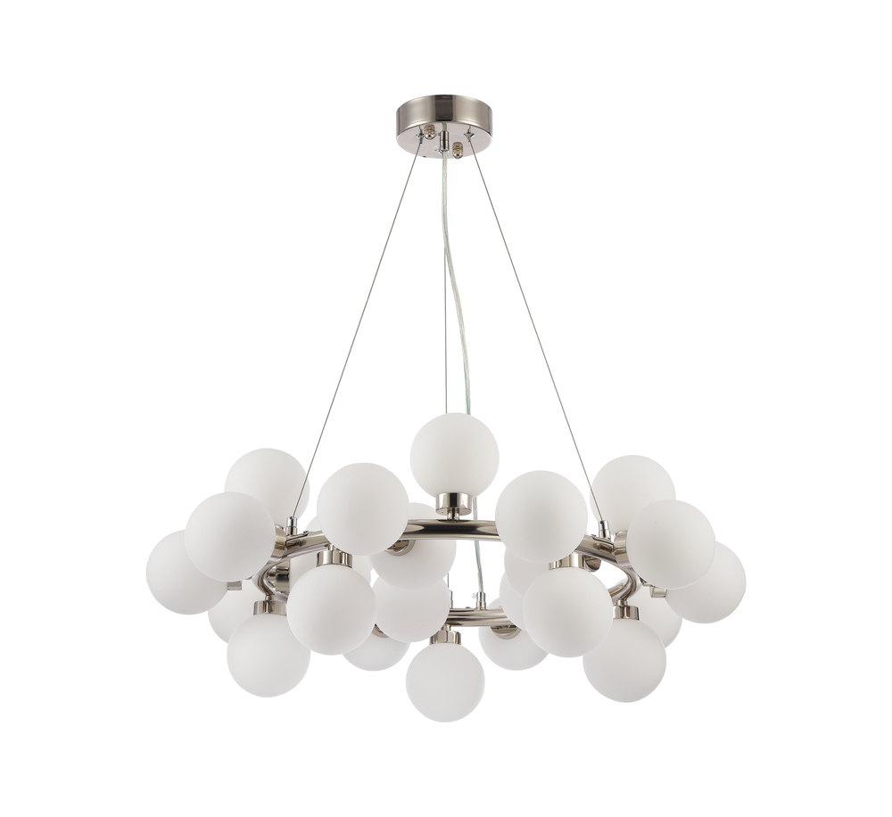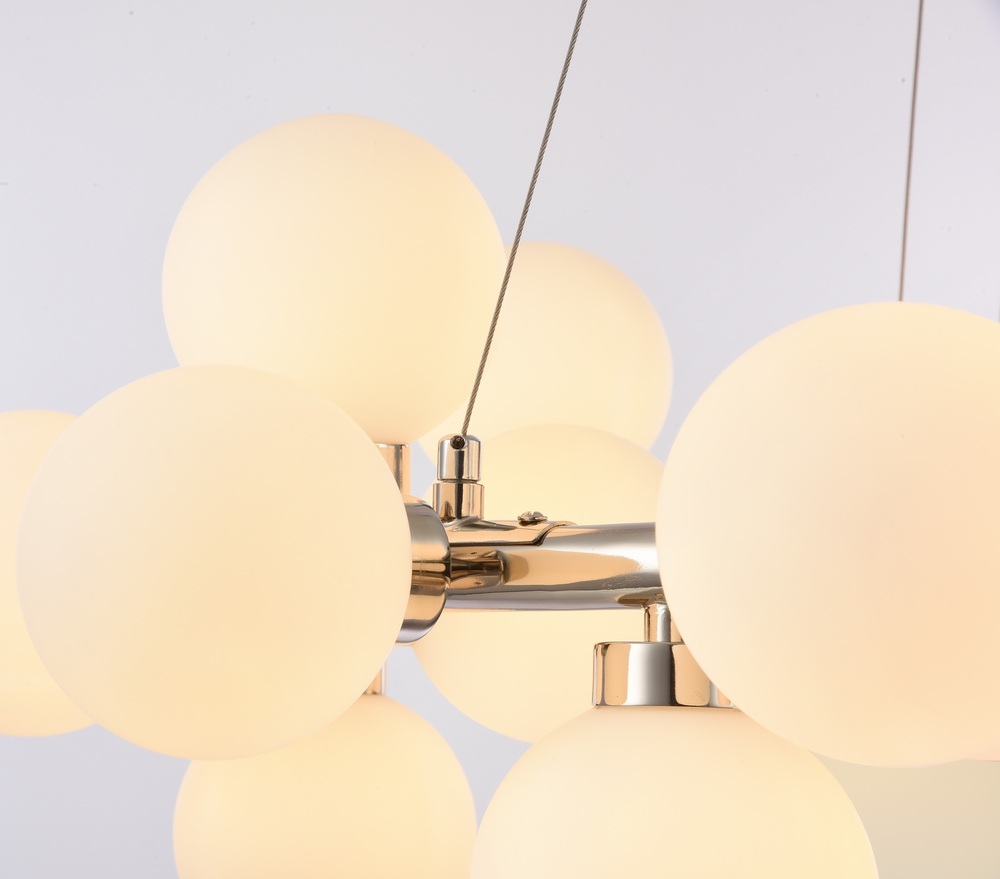 This exquisite chandelier has a round chrome metal frame. It comes with glass globe shades in milk white color. The adjustable cord links make this fixture suitable for most ceiling heights.
