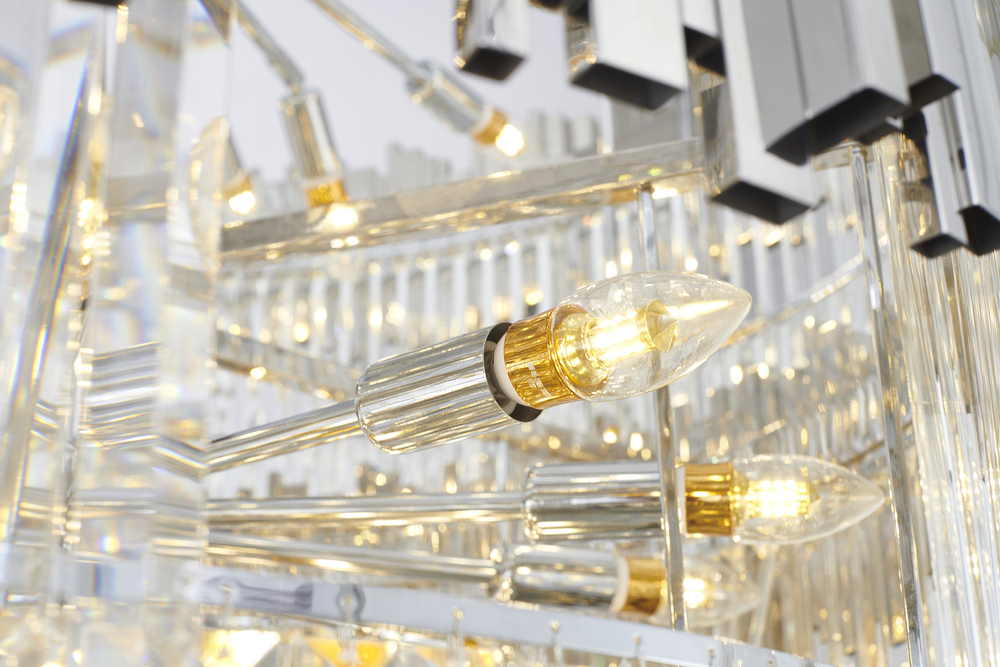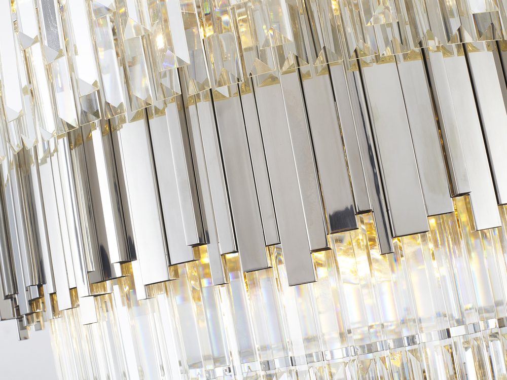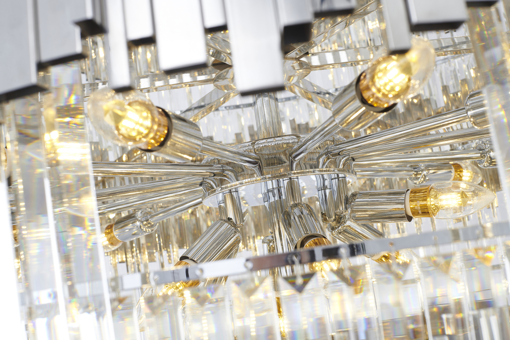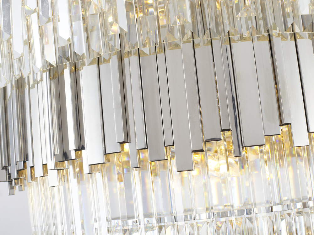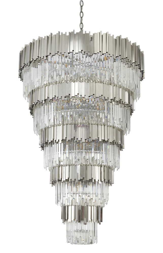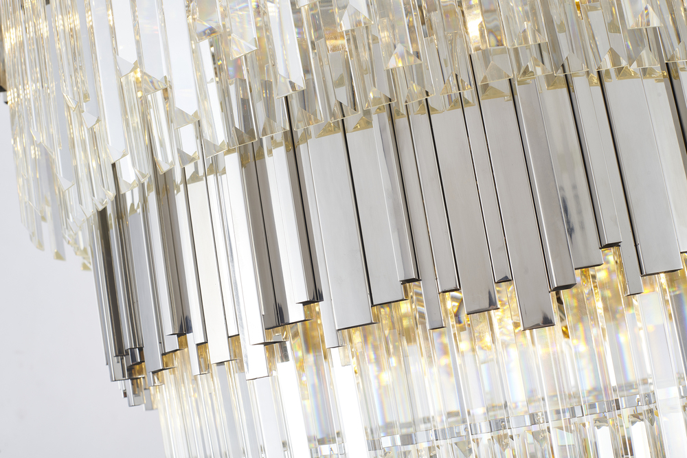 This chandelier is a five tier chrome frame chandelier. It comes with clear hanging crystals. The chain length of 2.5 meters is provided and the chain length is adjustable.