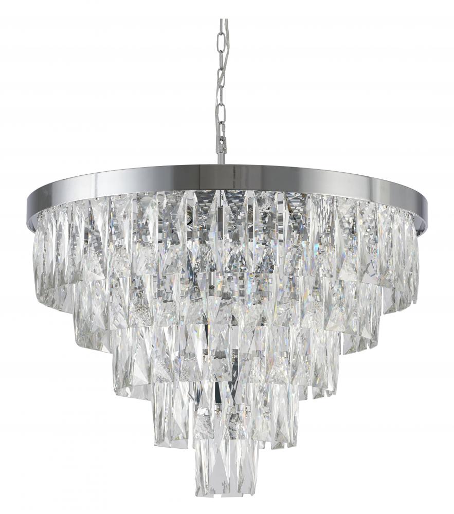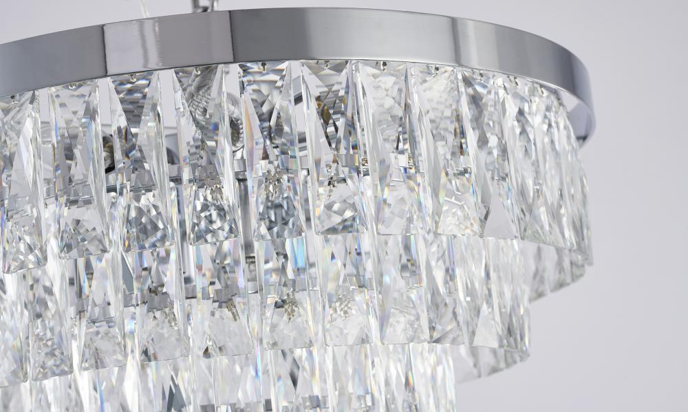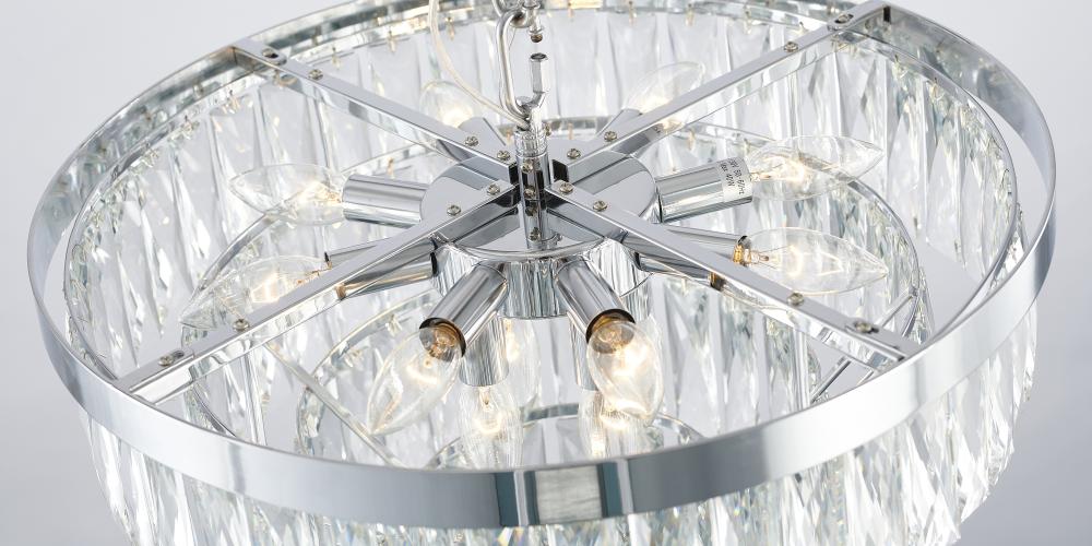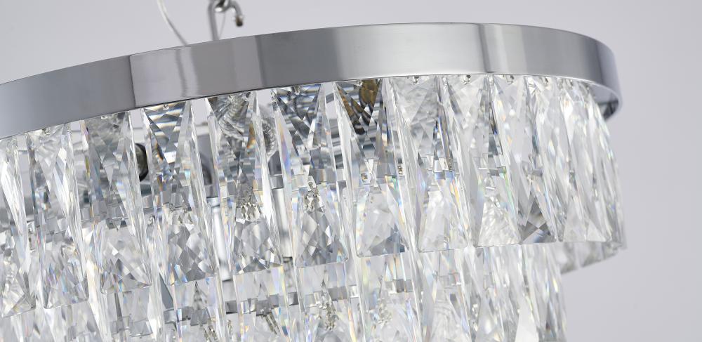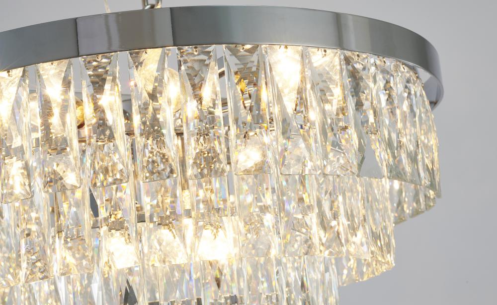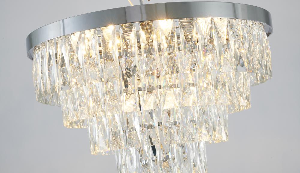 This chandelier is a five tier chrome metal frame chandelier. It comes with clear hanging crystals. The chain length of 59 inches is provided and the chain length is adjustable.