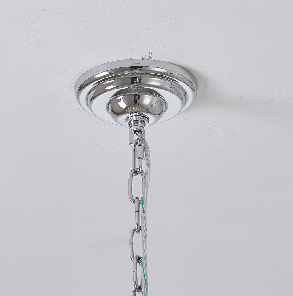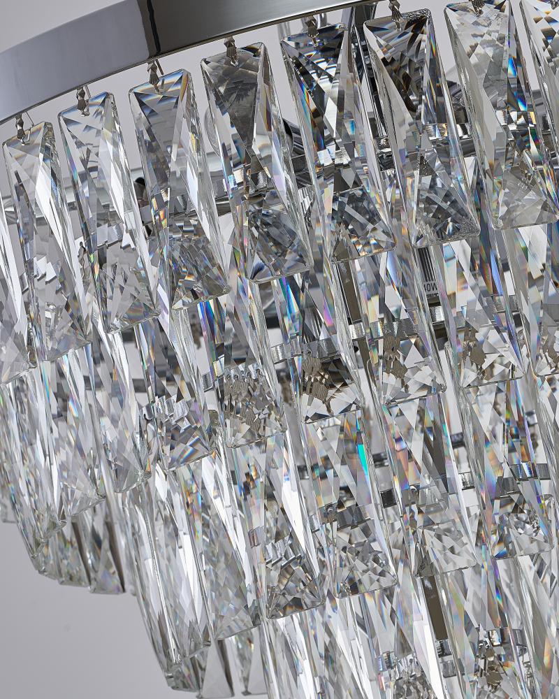 This chandelier is a six tier chrome metal frame chandelier. It comes with clear hanging crystals. The chain length of 59 inches is provided and the chain length is adjustable.