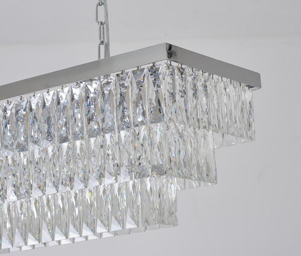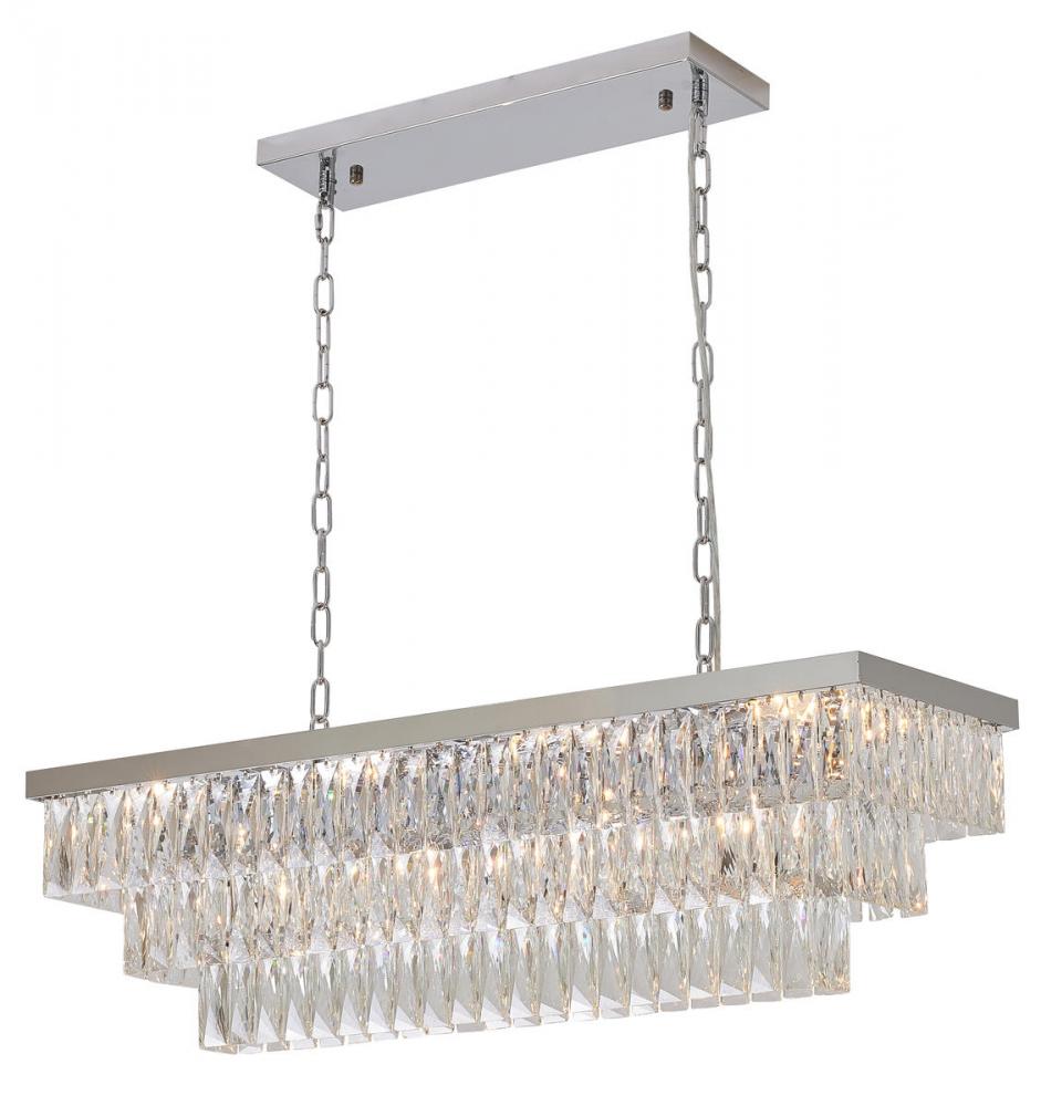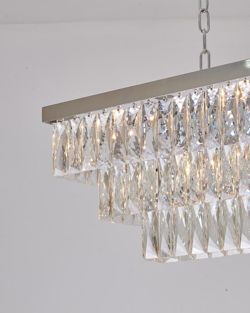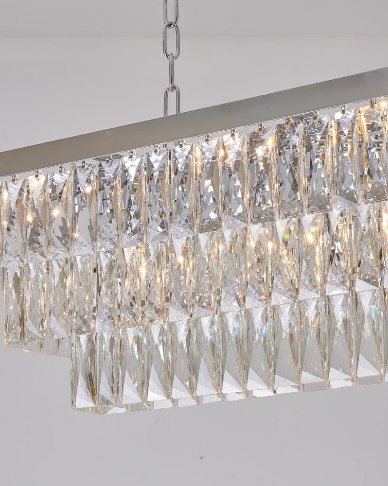 This chandelier has three tiers in a rectangular shape, the frame is made out of metal in a chrome finish. It comes with clear hanging crystal accents. The adjustable chain link makes this chandelier suitable for most ceiling heights.