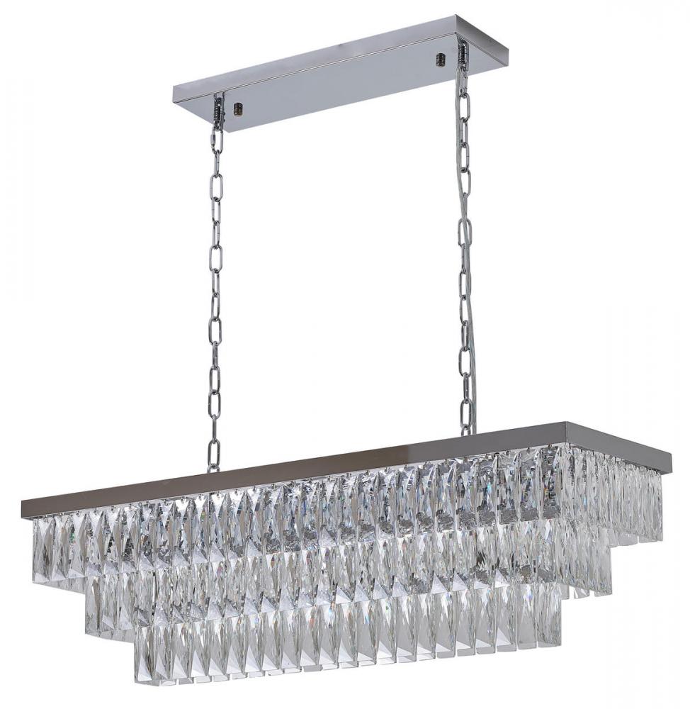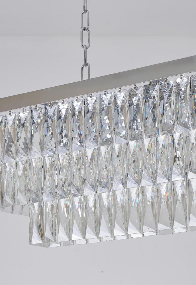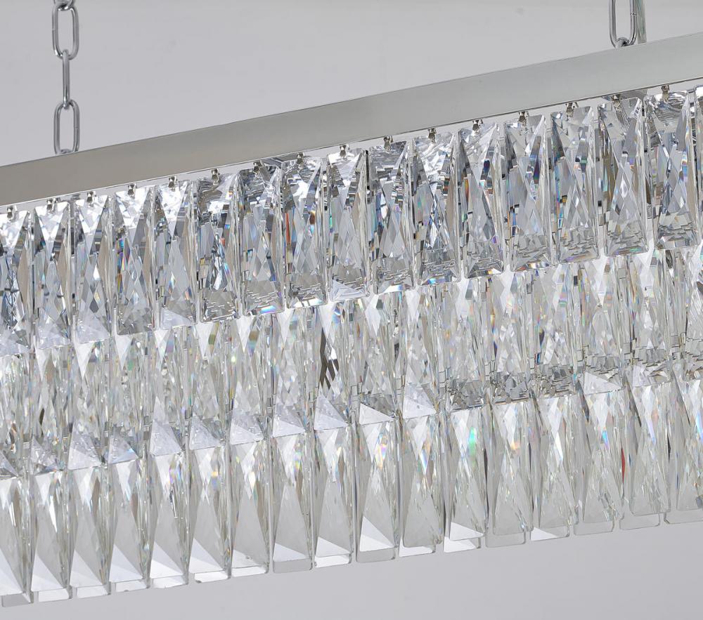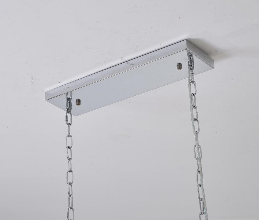 This chandelier has three tiers in a rectangular shape, the frame is made out of metal in a chrome finish. It comes with clear hanging crystal accents. The adjustable chain link makes this chandelier suitable for most ceiling heights.