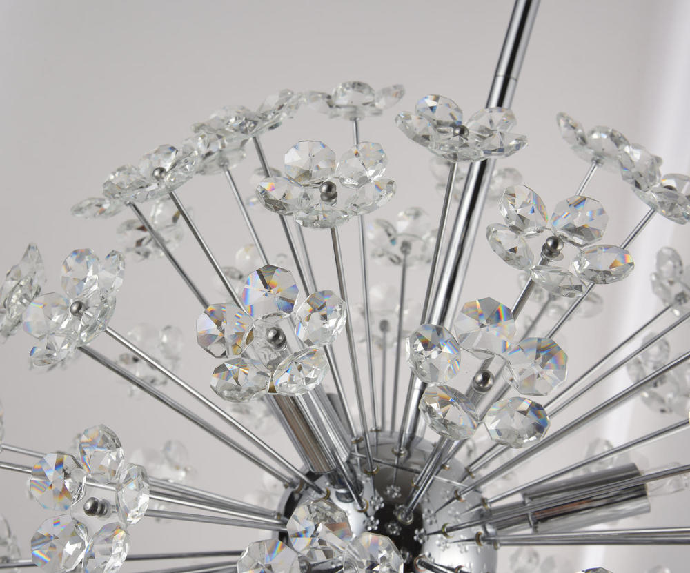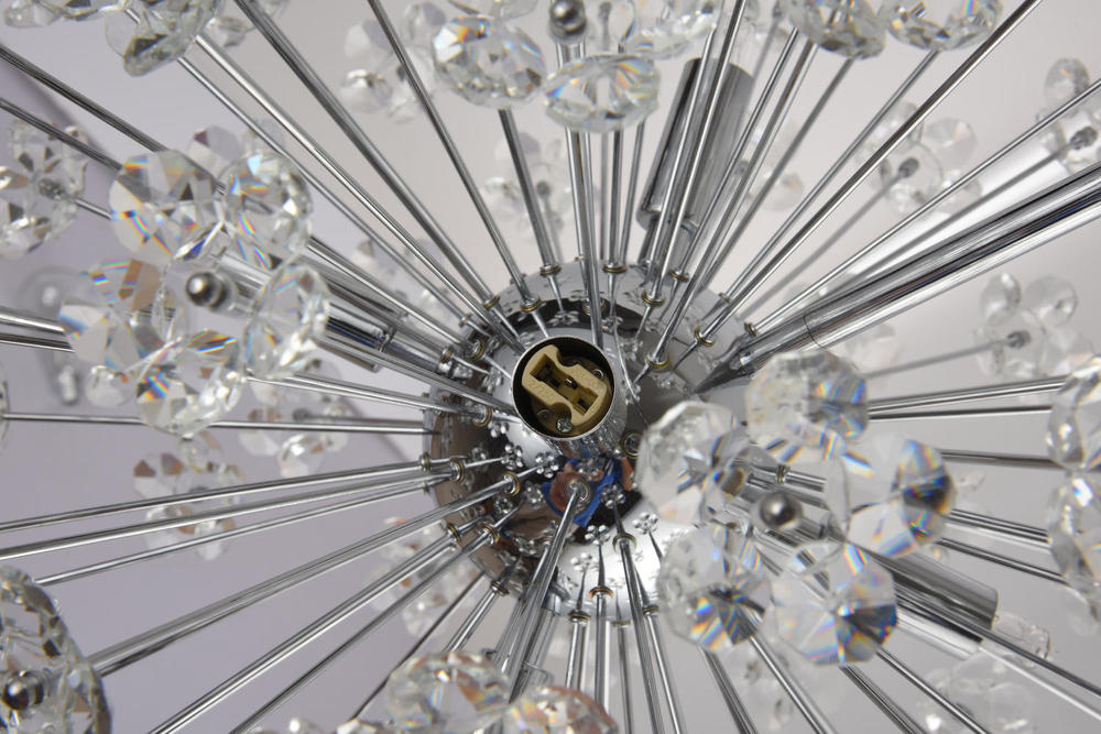 This exquisite chandelier is in a chrome finish. The frame is made out of metal, and it comes with clear crystal accents in sputnik flower shape. The adjustable rod link makes this fixture suitable for most ceiling heights.