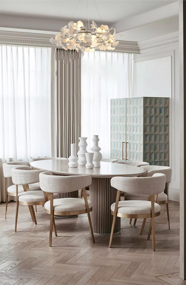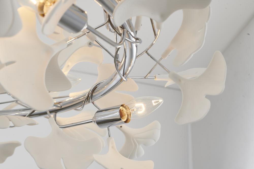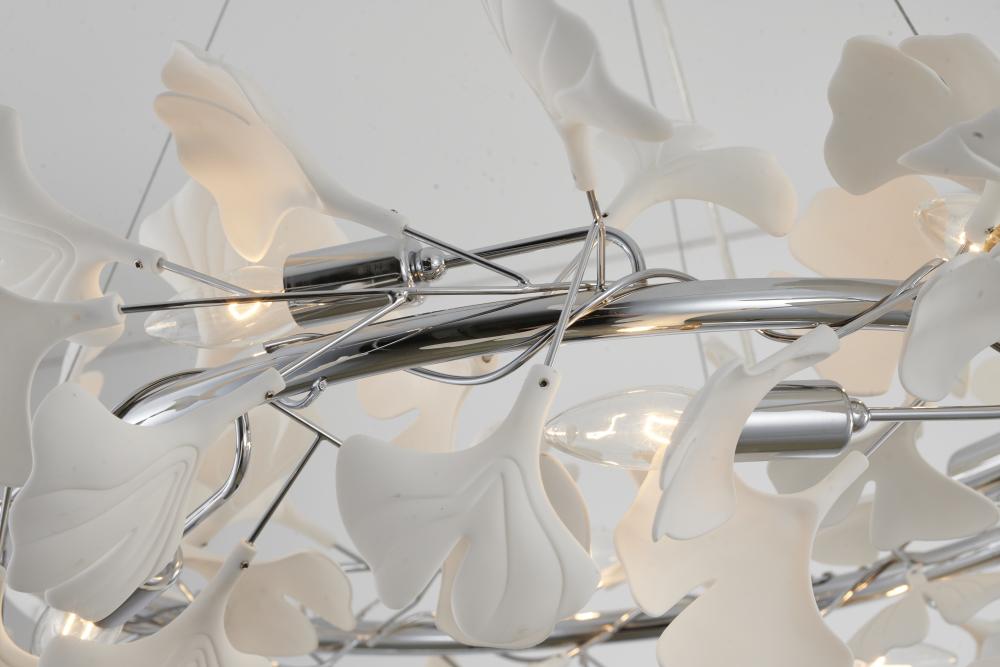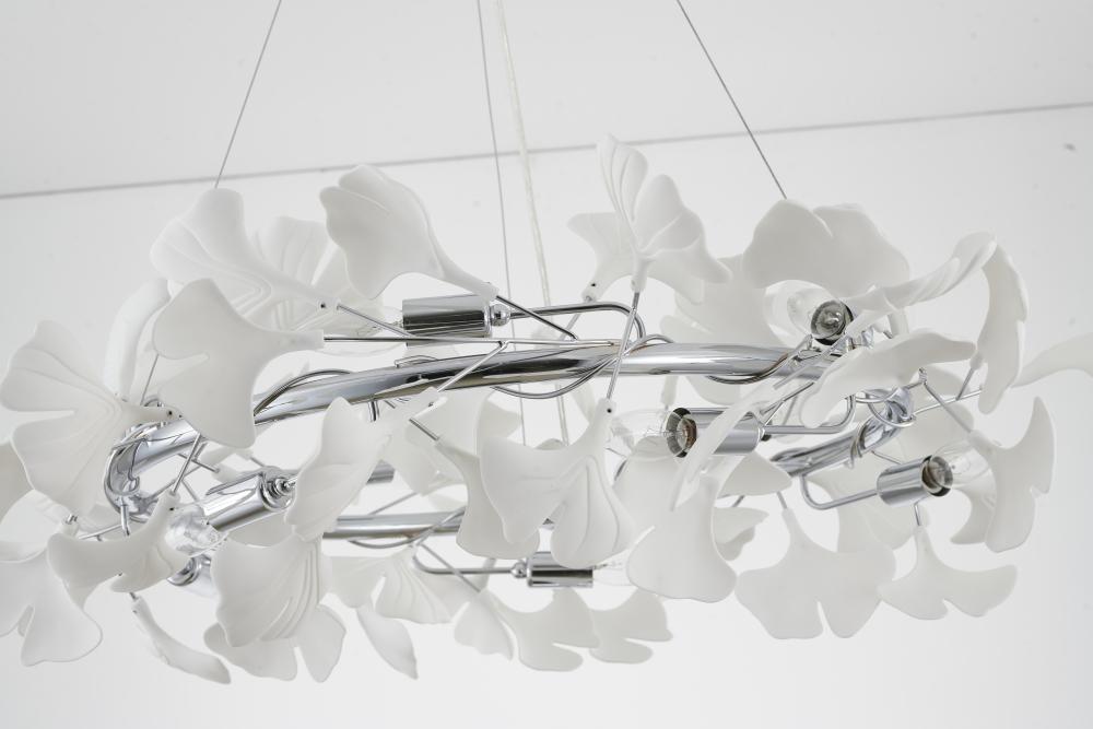 This chandelier is in a chrome finish. It comes with white acrylic leaf accents. The cord length of 78.7 inches is provided and the cord length is adjustable.