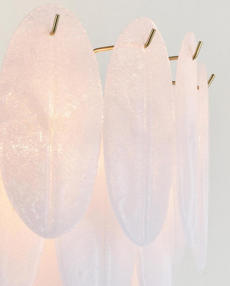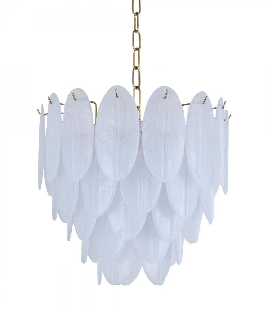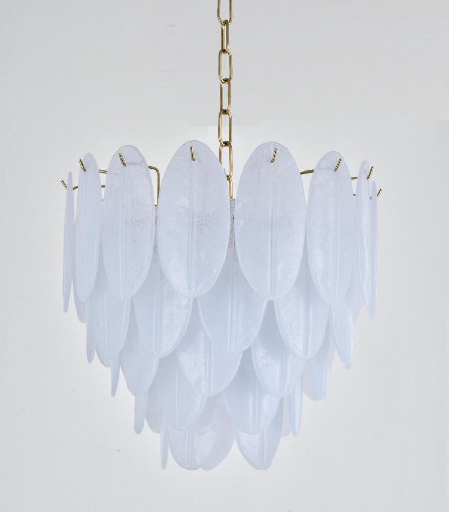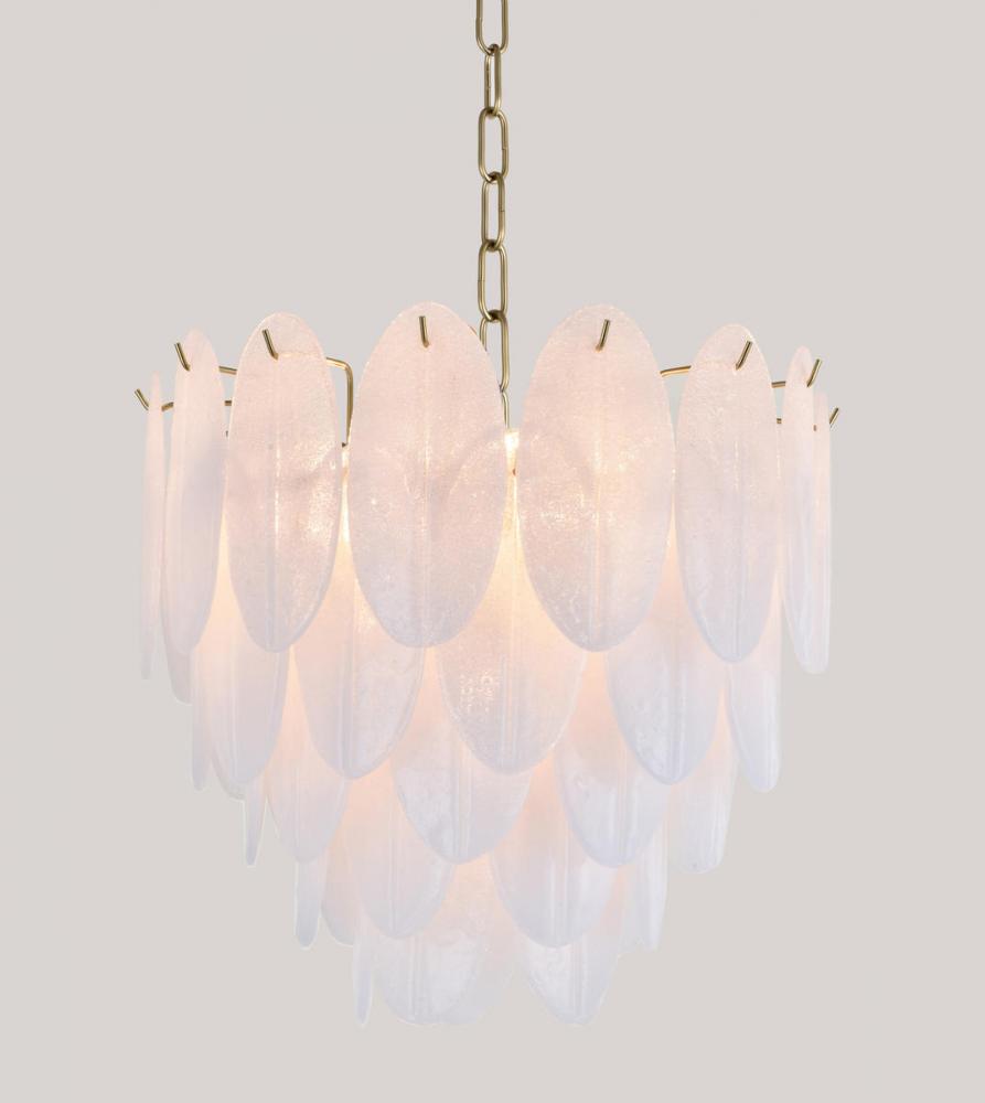 This exquisite chandelier is in a copper finish. The frame is made out of metal, and it comes with frosted hanging petal glass. The adjustable chain length makes this fixture suitable for most ceiling heights.