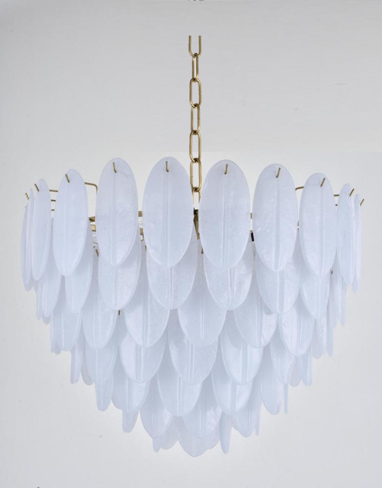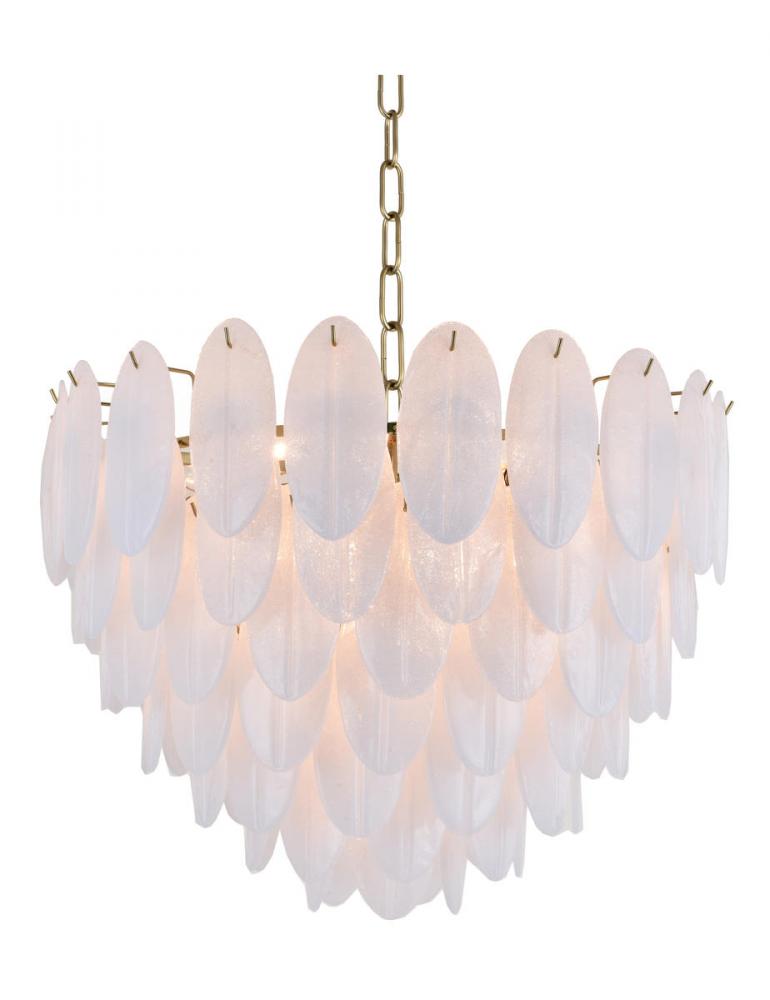 This seven tier chandelier is in a copper finish. The frame is made out of metal, and it comes with frosted hanging petal glass. The adjustable chain link makes this chandelier suitable for most ceiling heights
