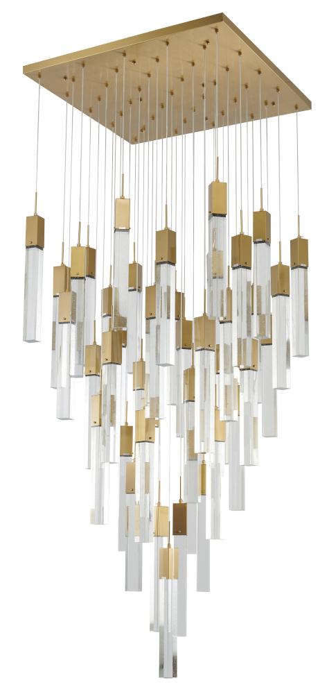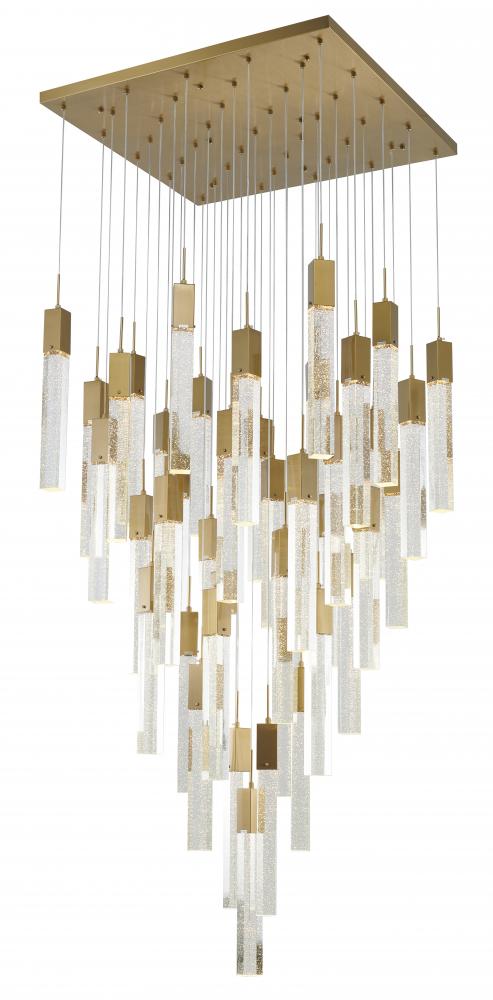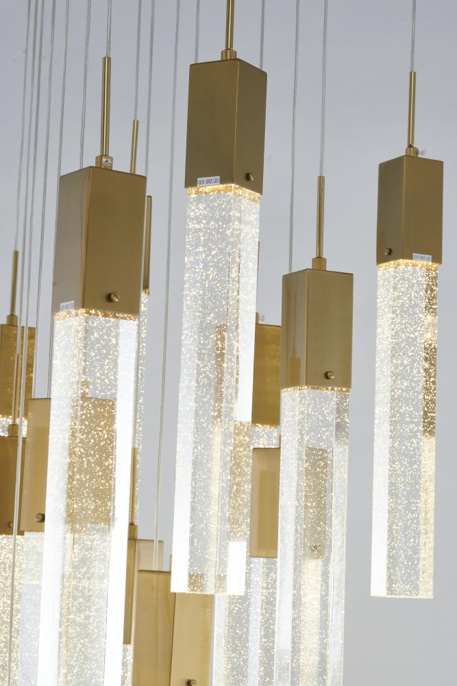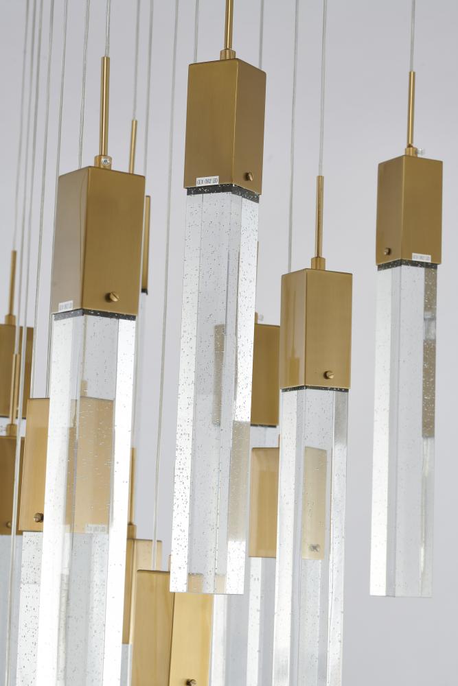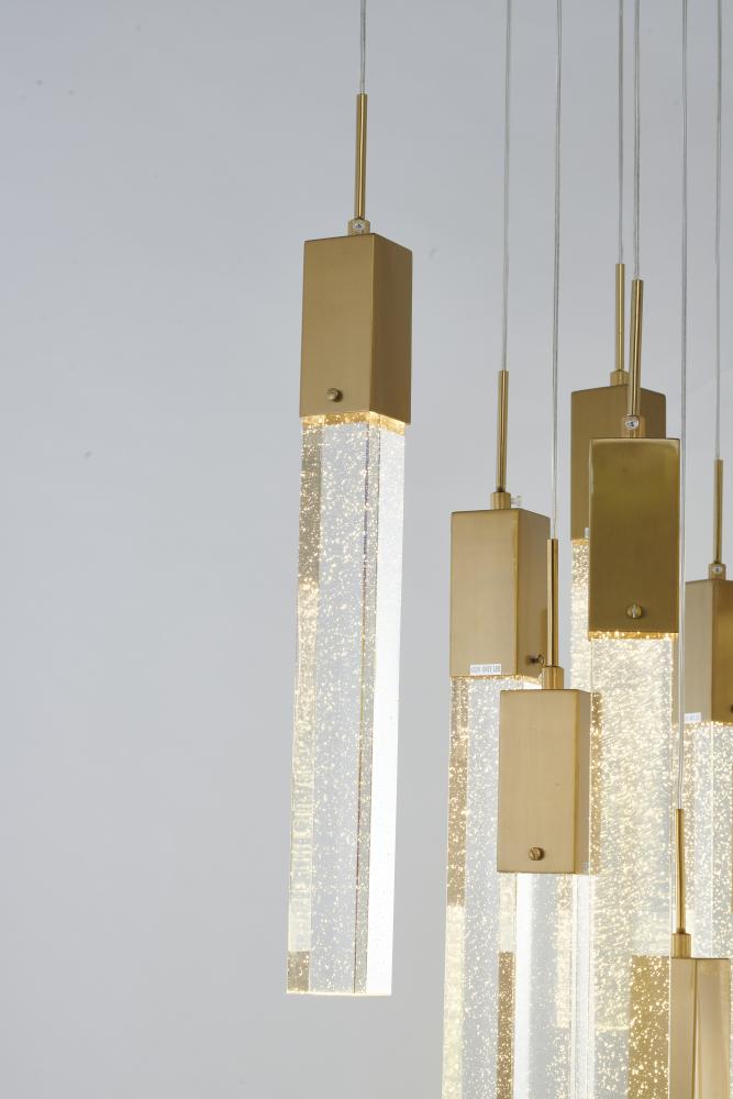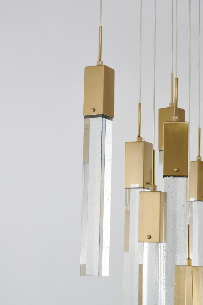 This chandelier is a gold flushed frame chandelier. It comes with clear hanging block bubble crystals. The cord length of 3.7 meters is provided and the cord length is adjustable.