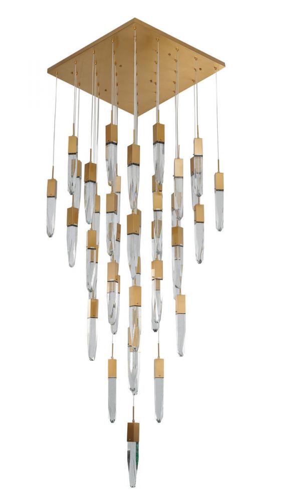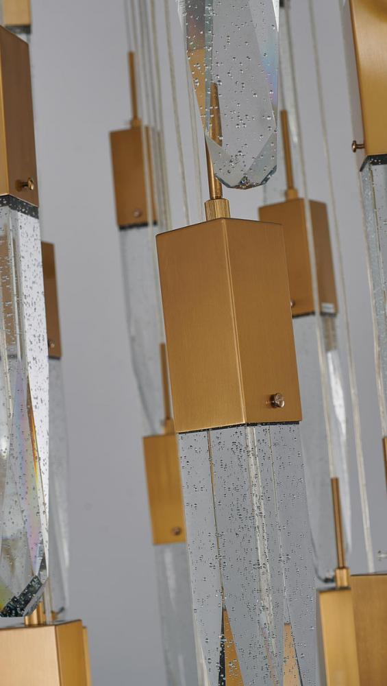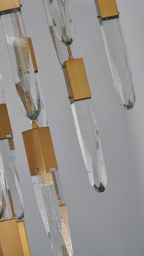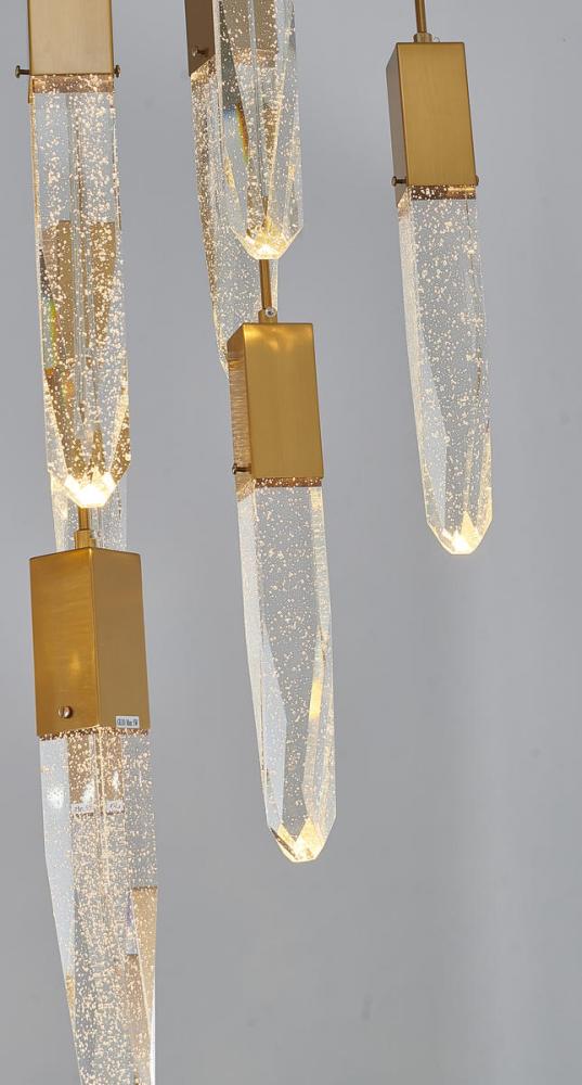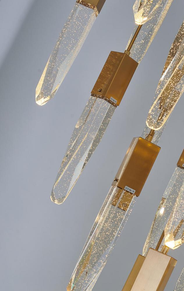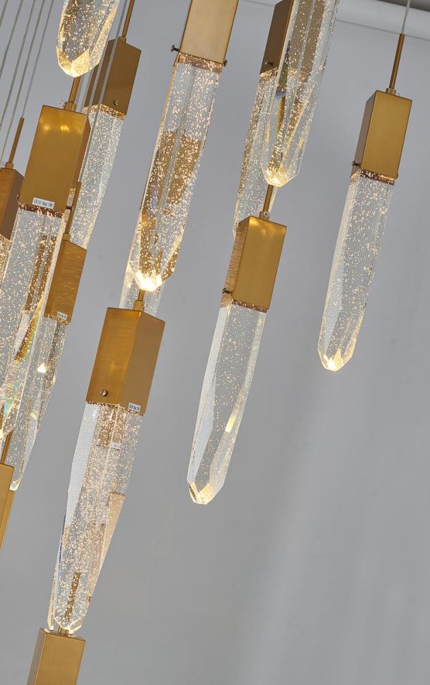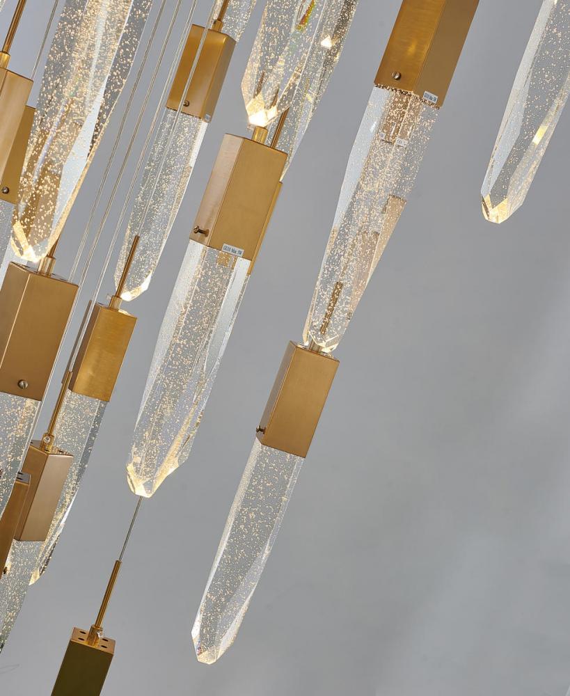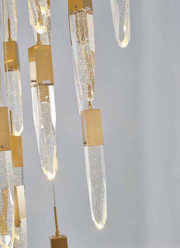 This exquisite chandelier is in a gold finish. The frame is made out of metal, and it comes with hanging clear iceberg bubble crystals. The length of cords can be adjustable and make this fixture suitable for most ceiling heights