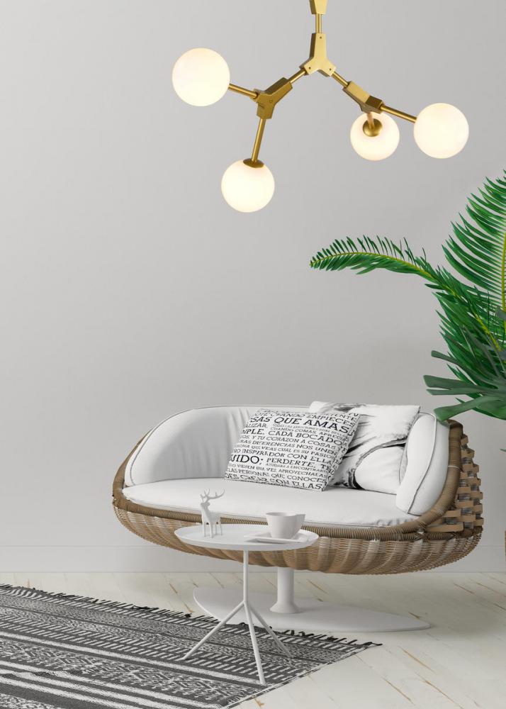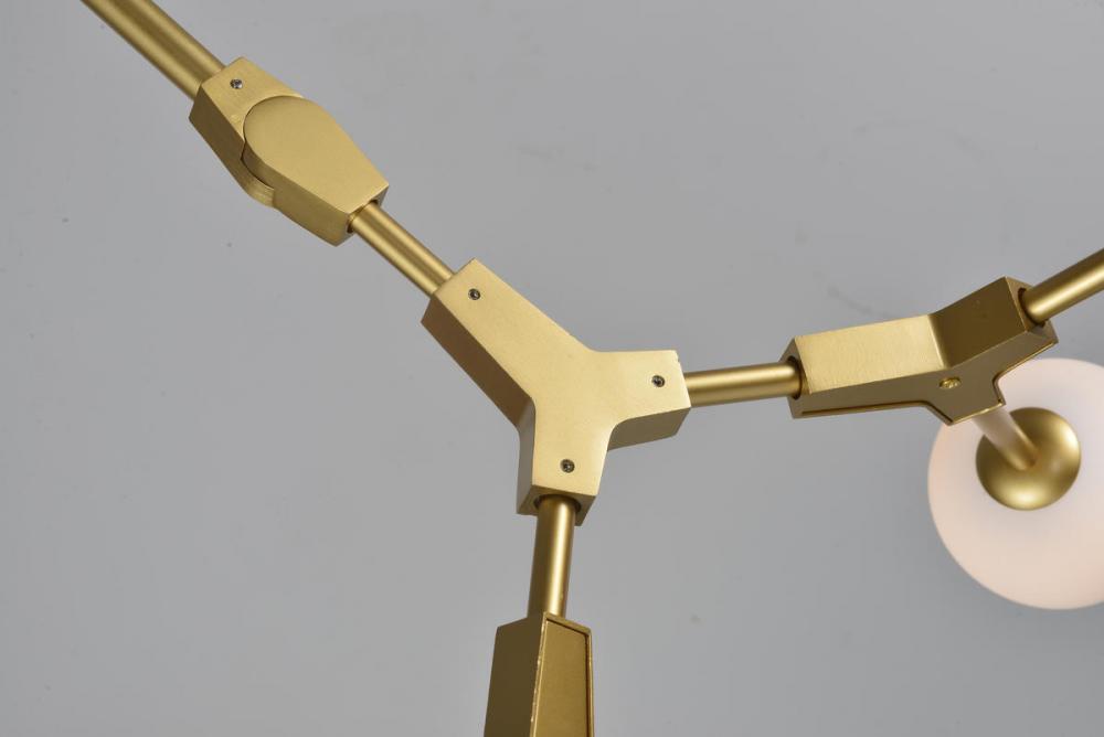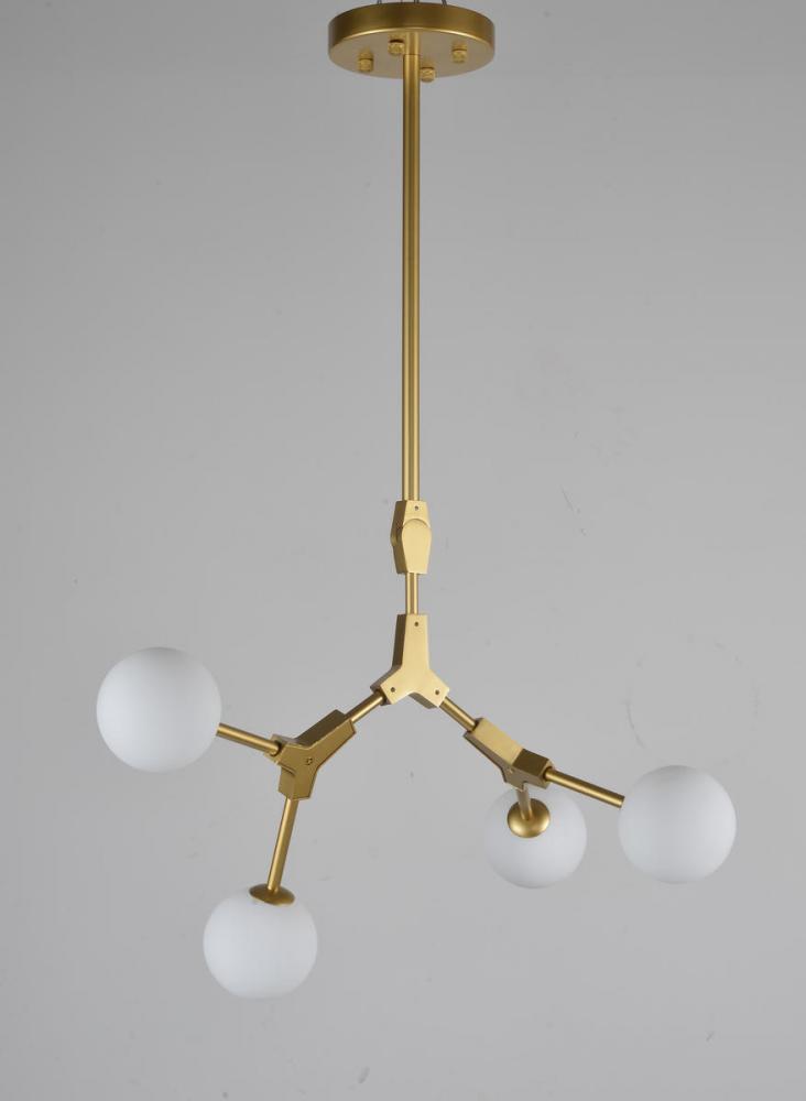 This modern ceiling fixture has an gold metal frame. It comes with glass globe shades in white color. The adjustable rod link makes this fixture suitable for most ceiling heights.