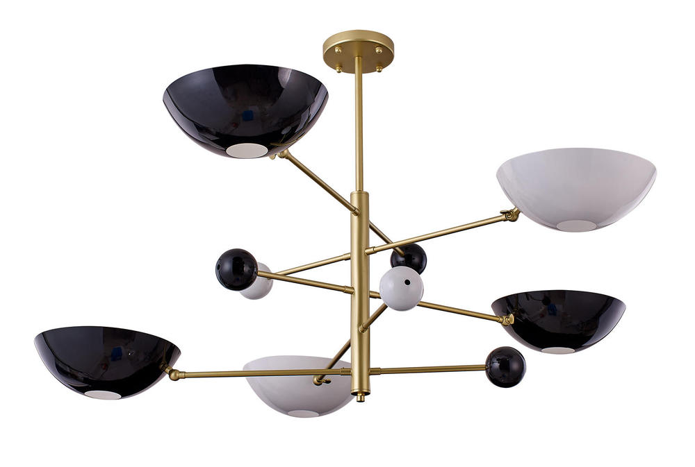 This unique chandelier is in gold finish. The frame is made out of metal, and it comes with disk plates in white and black color. The adjustable rod link makes this fixture suitable for most ceiling heights.