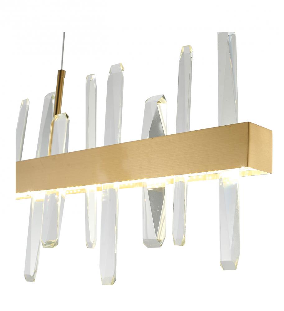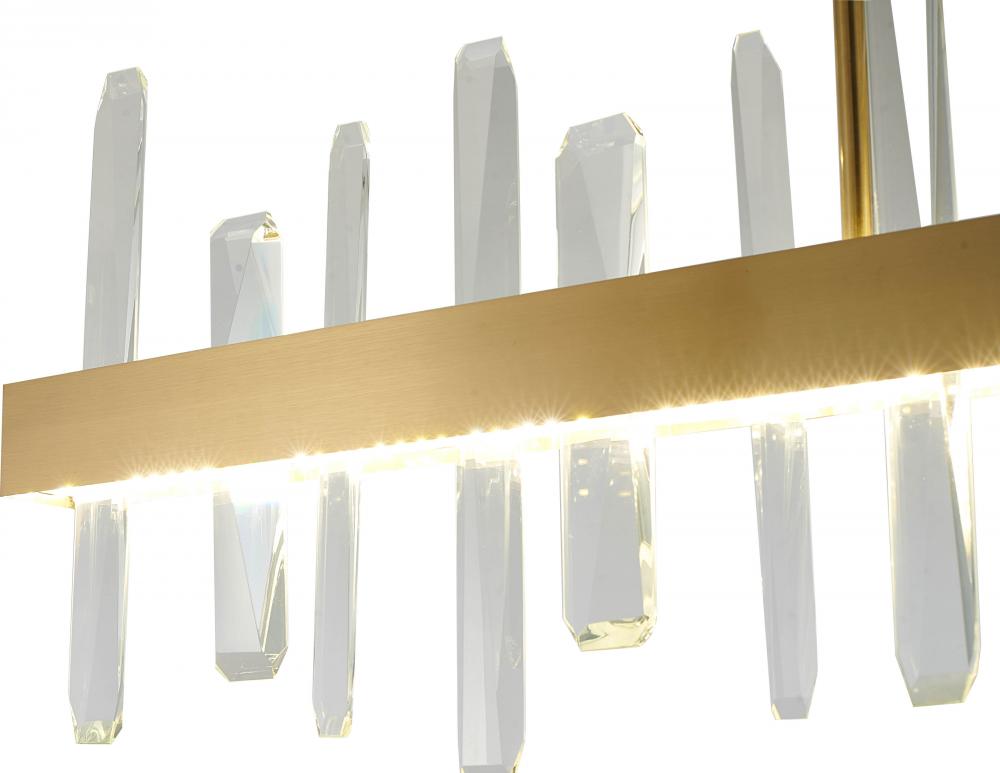 This chandelier is in a gold finish. It comes with clear crystals. The cord length of 72 inches is provided and the cord length is adjustable.