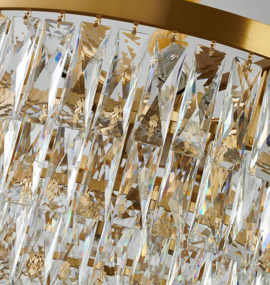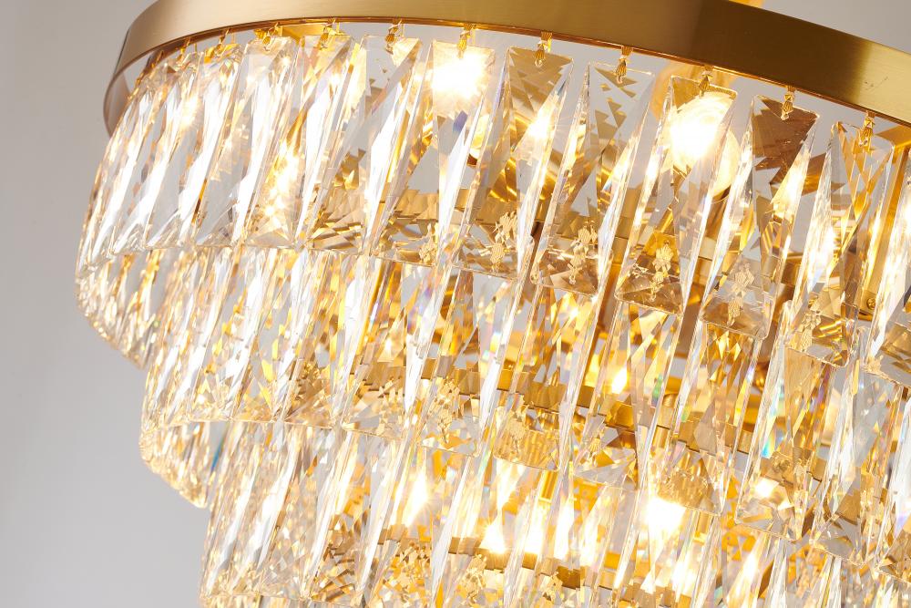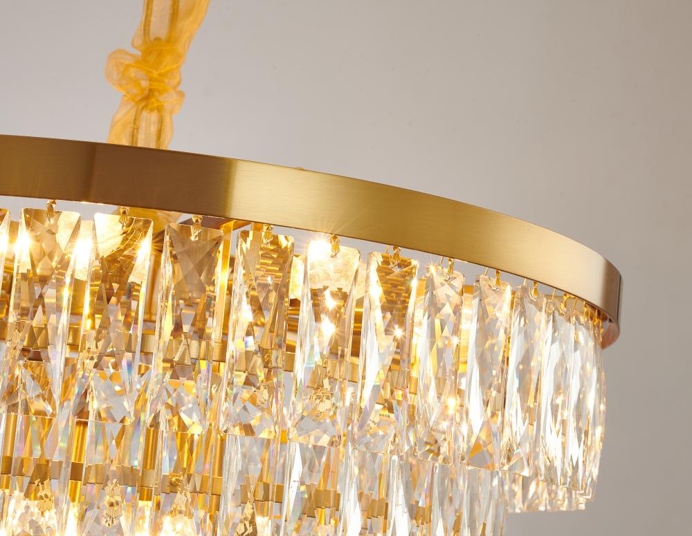This chandelier is a round gold metal frame chandelier. It comes with six tiers of clear hanging crystals. The chain length of 59 inches is provided and the chain length is adjustable.