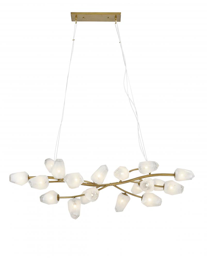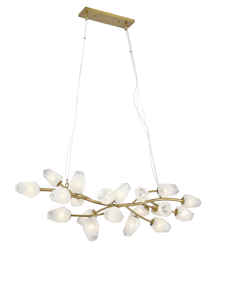 This chandelier is a gold branch frame chandelier. It comes with white glass shades. The cord length of 70 inches is provided and the cord length is adjustable.
