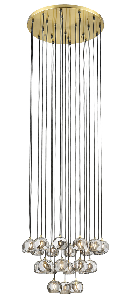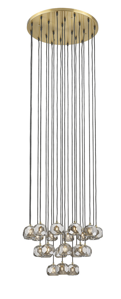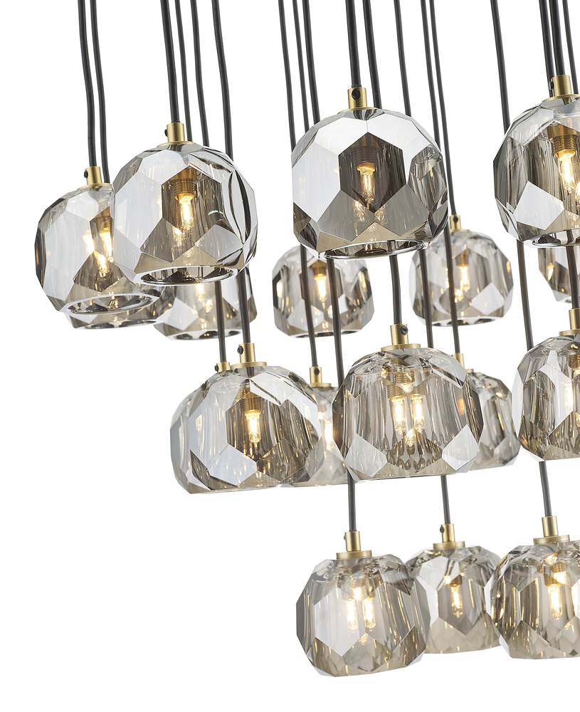 This chandelier is a gold flushed frame chandelier. It comes with hanging smoke glass pendants. The cord length of 108 inches is provided and the cord length is adjustable.