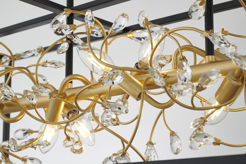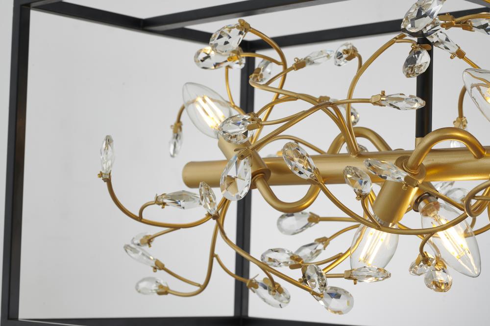 This chandelier is a black rectangular cage frame chandelier. It comes with a gold branch accent and clear crystals. The rod lengths of 12" + 12" + 6" + 6" is provided and the rod length is adjustable.