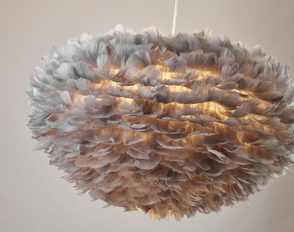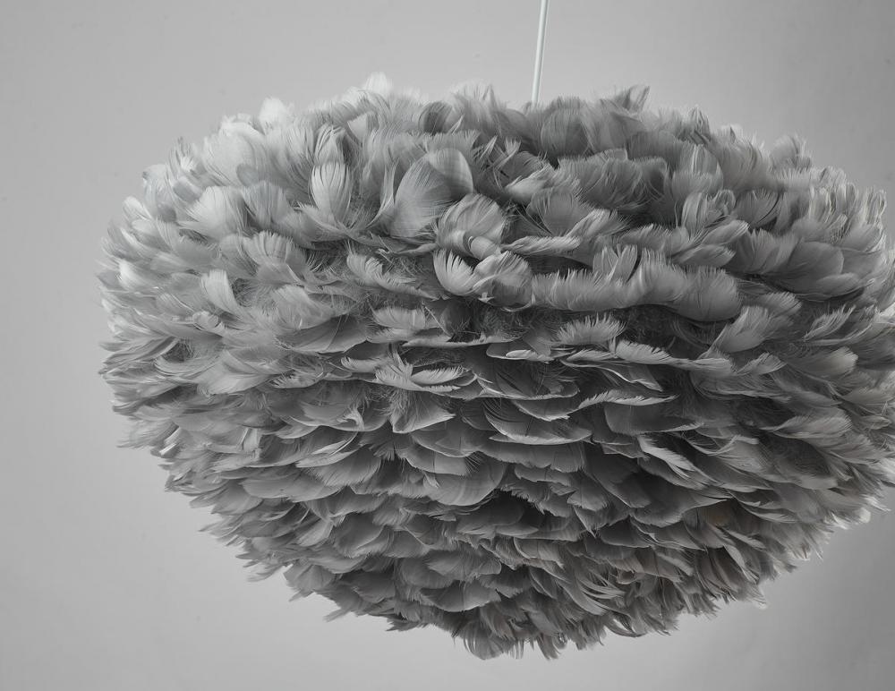 This unique ceiling fixture is in a white finish. The frame is made out of iron in white color, and it is surrounded by goose feather in grey color. The adjustable cord link makes this fixture suitable for most ceiling heights.