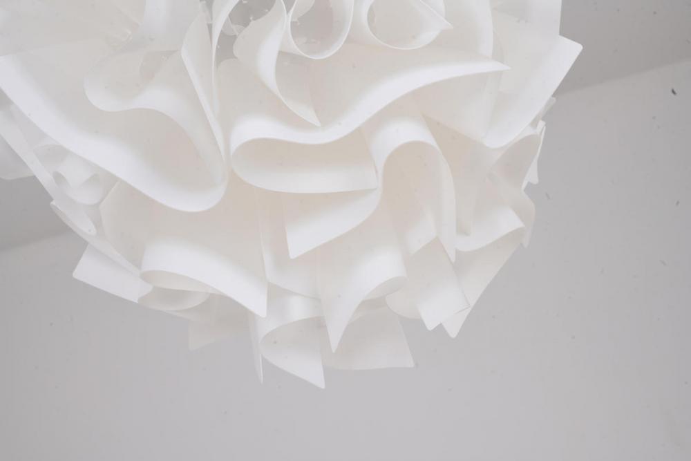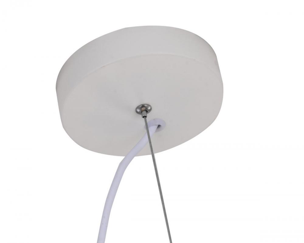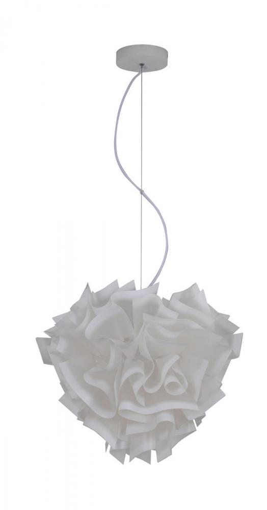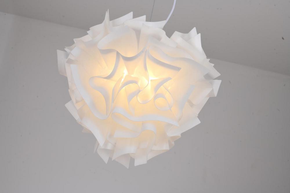 This unique chandelier is in a white finish. The frame is made out of iron, and it comes with a white acrylic shade in a flower shape. The adjustable cord link makes this fixture suitable for most ceiling heights.