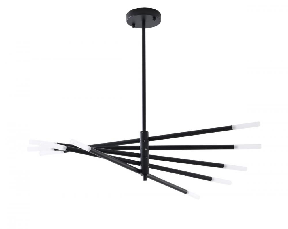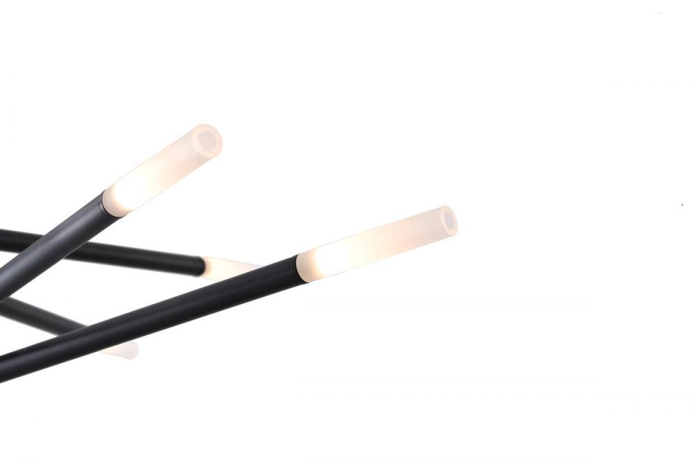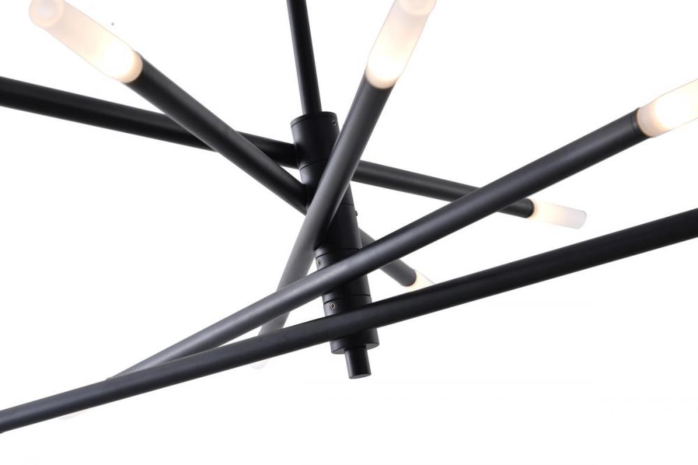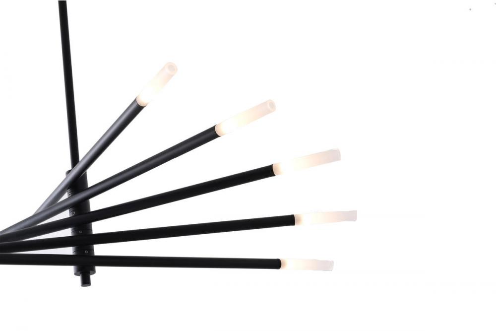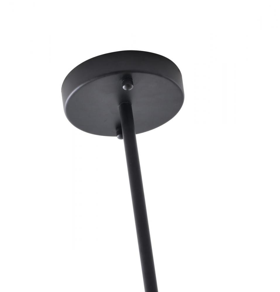 This exquisite chandelier is in a black finish. The frame is made out of iron, and it comes with frosted glass shades. The adjustable rod link makes this fixture suitable for most ceiling heights.