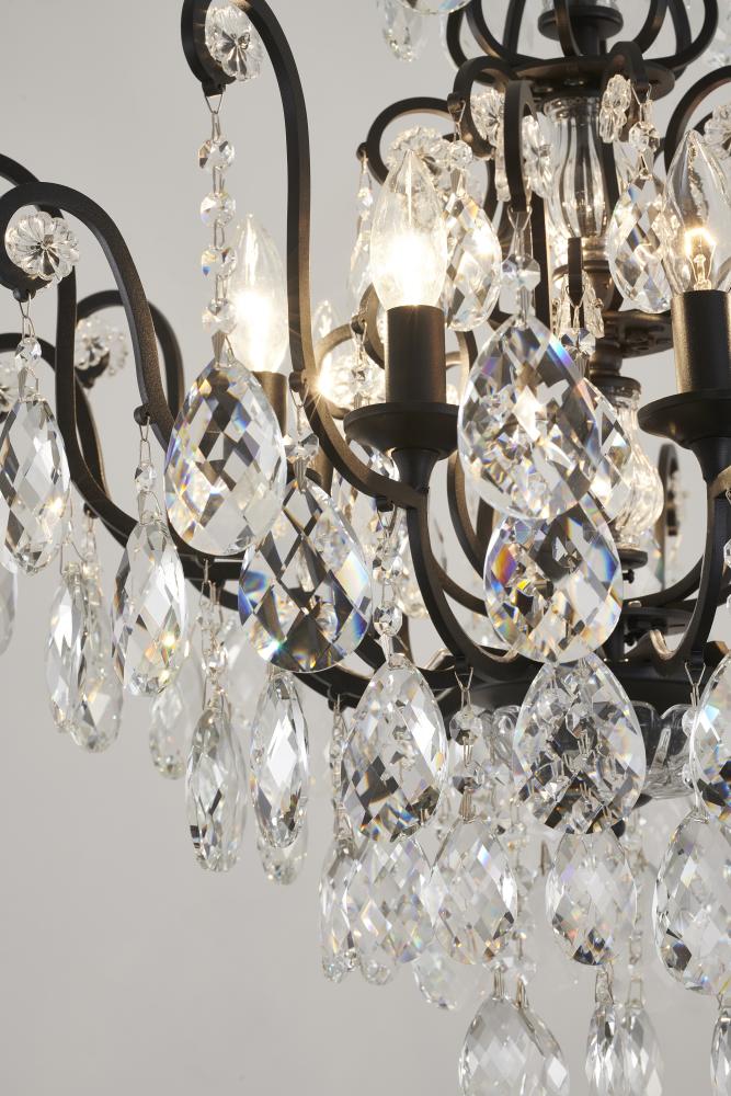 This chandelier is a matte black chandelier. It comes with clear hanging crystals and glass accents. The chain length of 59 inches is provided and the chain length is adjustable.