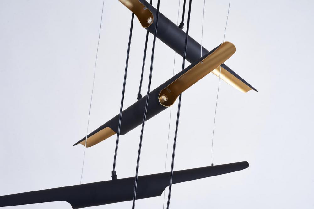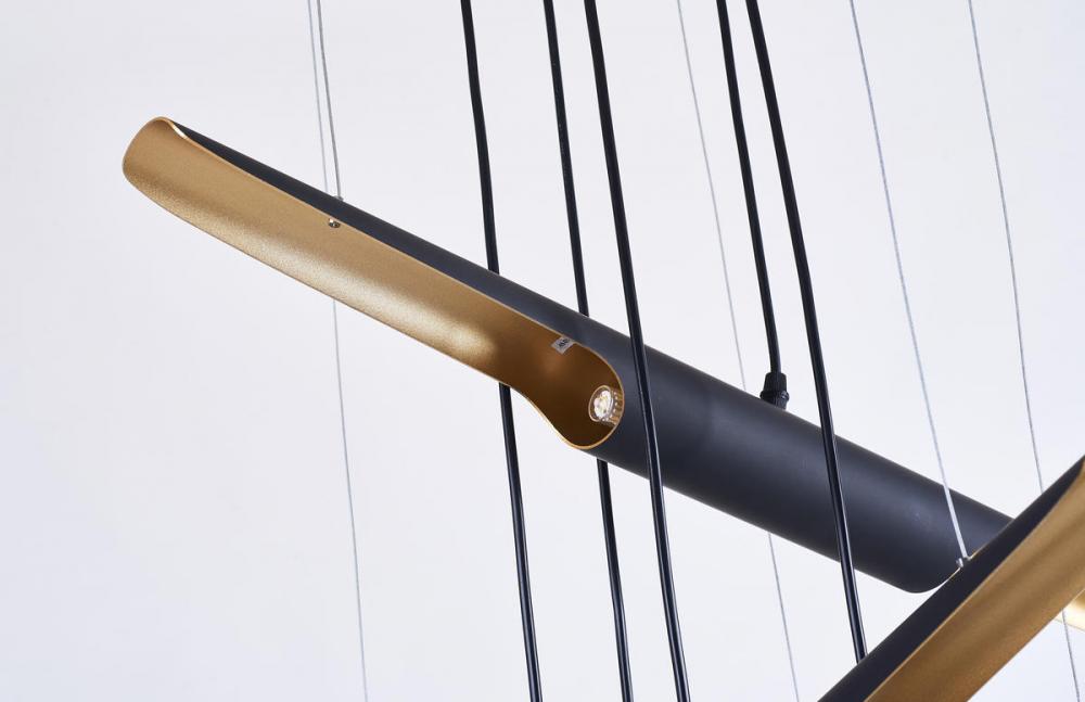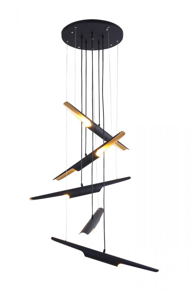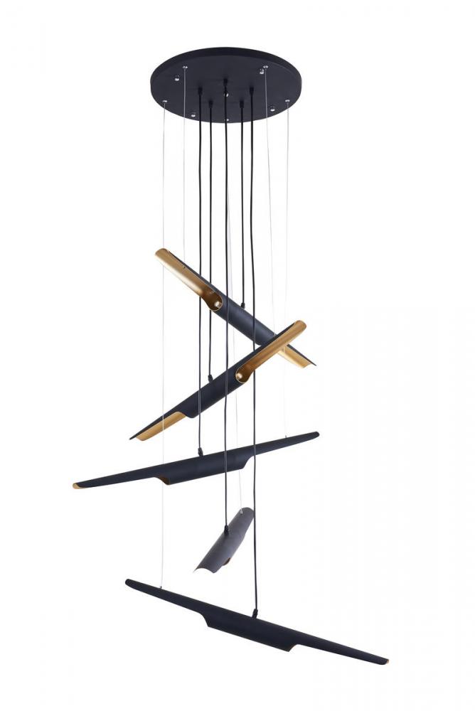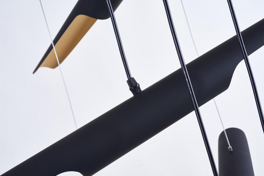 This unique flushed chandelier is in a matte black finish with gold interior. The frame is made out of metal with five hanging pendant tubes. The adjustable cord links make this fixture suitable for most ceiling heights.